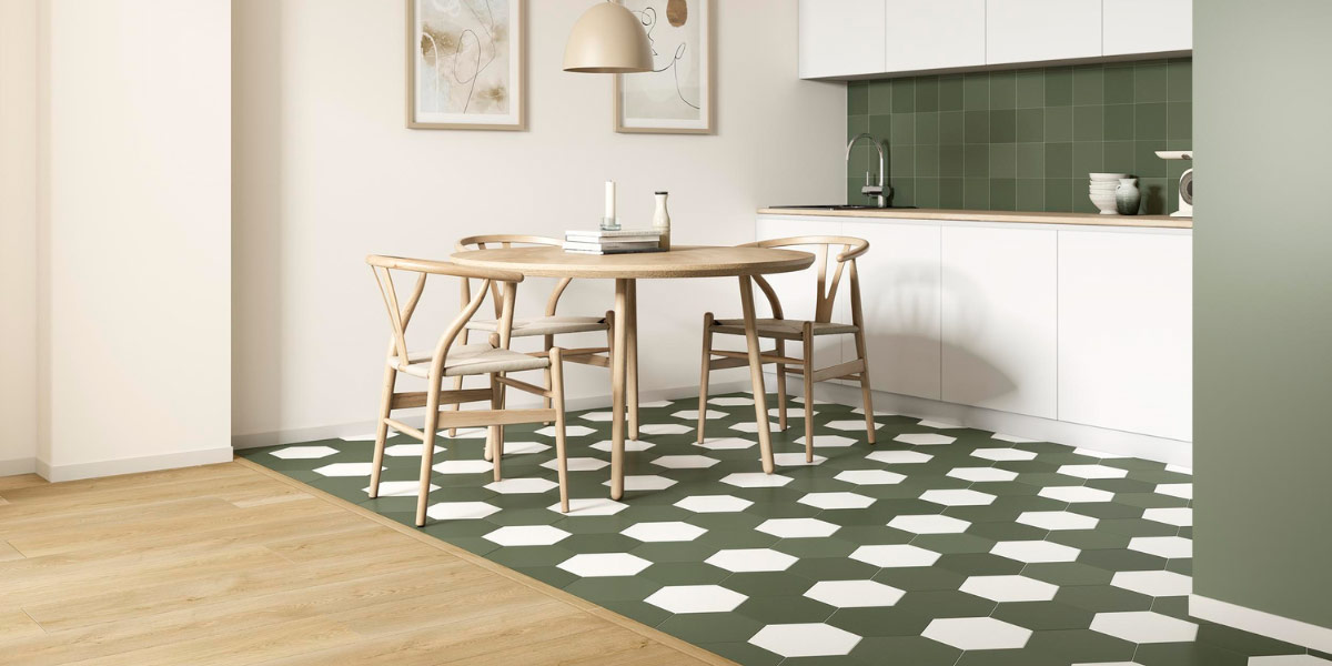 - Azulejos hidráulicos o geométricos. Las baldosas cerámicas hidráulicas pueden crear un contraste llamativo con los suelos de madera. Esto aporta un toque de color y personalidad a cualquier espacio. Por su parte, los azulejos geométricos hexagonales ofrecen una fusión de lo contemporáneo y lo tradicional. Los hexágonos aportan una sensación gráfica que contrasta con las líneas naturales de la madera.
