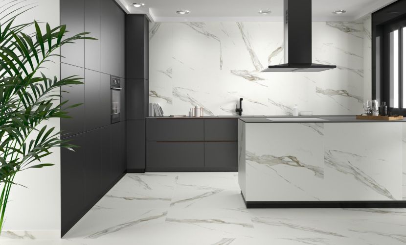 - Piezas de mármol: si lo que buscas es aportar elegancia y sofisticación a tu cocina, el mármol será tu mejor opción. Los azulejos porcelánicos con acabado efecto mármol aúnan belleza y practicidad, al tiempo que ofrecen altas prestaciones.