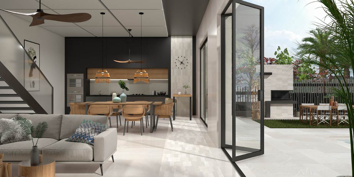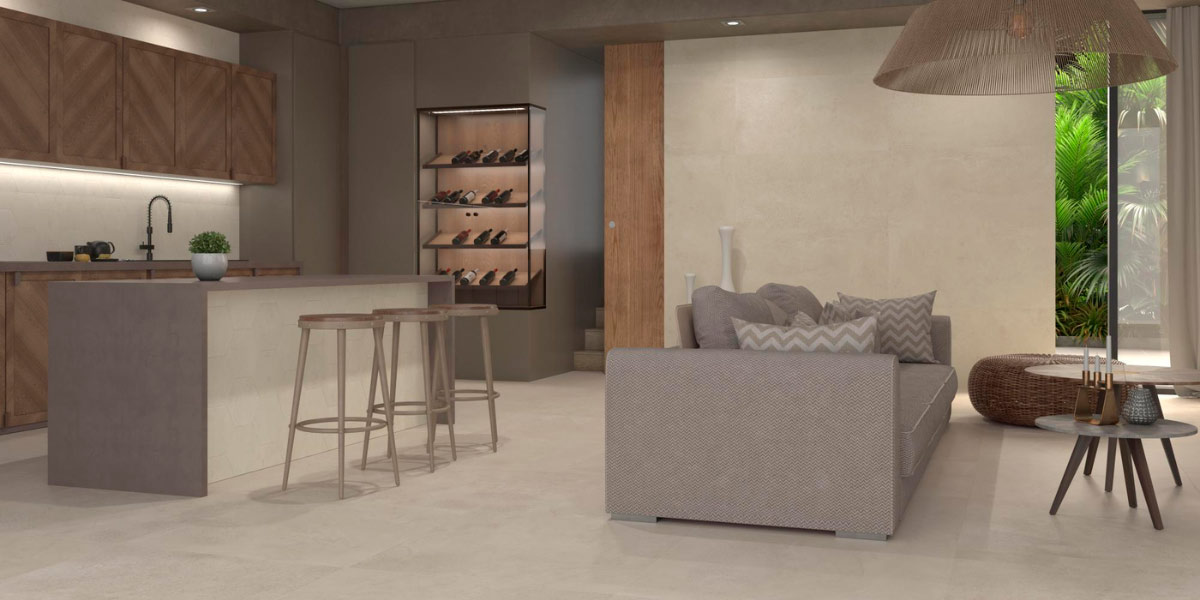 Dank ihrer Vielseitigkeit in Formaten, Oberflächen und Farben ist Keramik das ideale Material, um diese Verbindung zu schaffen. Durchgehende Bodenbeläge sorgen für visuelle Kontinuität, erweitern den Raum und bringen Ruhe in das Gesamtbild.