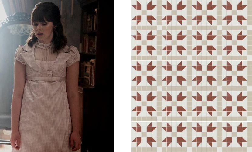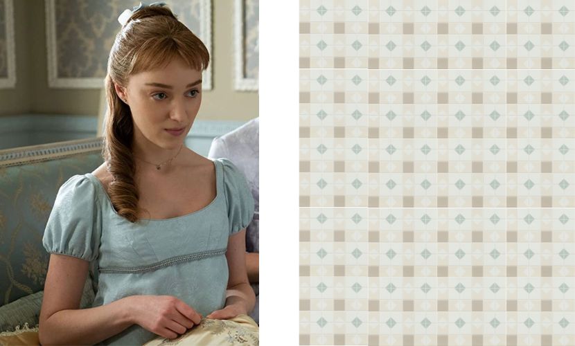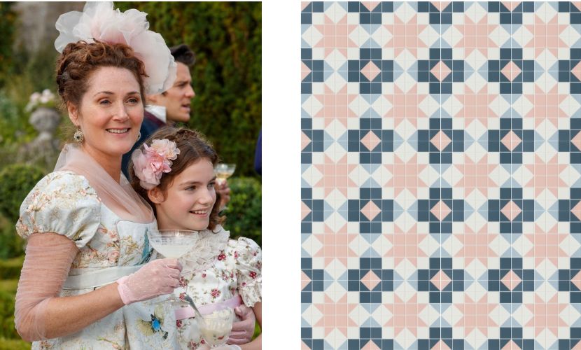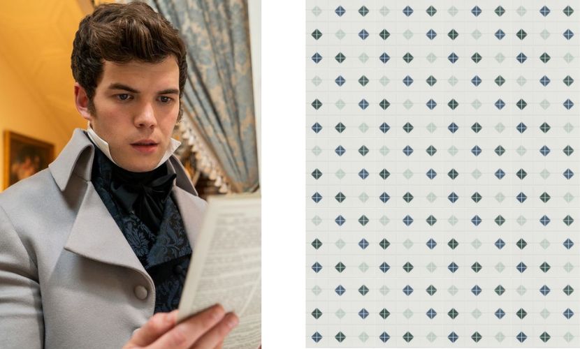 Aufgrund seiner großen Anpassungsfähigkeit haben wir jedoch für Benedict Bridgerton die Fliese Mintons Old White gewählt, die Basisfliese der Kollektion, die sich perfekt mit allen Designs kombinieren lässt. Und genau das ist es, was diese Figur verkörpert: Sie ist in der Lage, sich in die Umgebung einzufügen und sich an jede Situation anzupassen.