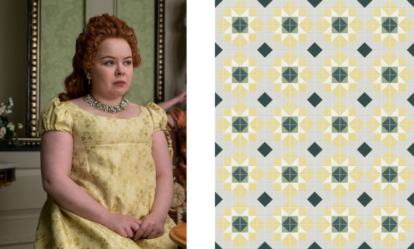 Natürlich passt die Fliese Bellamira perfekt zum Charakter von Penelope. Ihre gelbe Farbe mit genau dem richtigen Maß an Sättigung steht in direktem Zusammenhang mit der Säure ihrer Persönlichkeit. Obwohl viele versuchen, sie lächerlich zu machen, vor allem ihre Mutter, ist Penelope viel temperamentvoller als das und erfindet sich jeden Tag neu, um ihren Platz am britischen Hof zu finden.