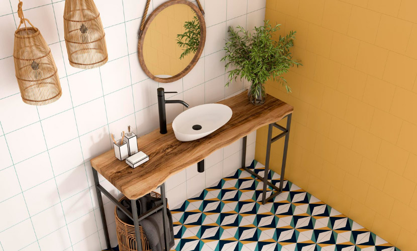 Weiter geht es mit der Serie Ibiza Mostaza, die sich dank ihrer Oberfläche mit leichtem Wasser perfekt für Räume voller Frische eignet. Um die Atmosphäre zu bereichern, kann sie mit Ibiza Decor Mostaza kombiniert werden, einer Collage aus kleinen Geometrien, bei der Weiß mit Farbe kombiniert wird. Ideal zur Hervorhebung von Bereichen wie Bars, Hauptwänden, Duschbereichen oder Küchenwänden. Das folgende Bild zeigt die Kombination der beiden Serien.