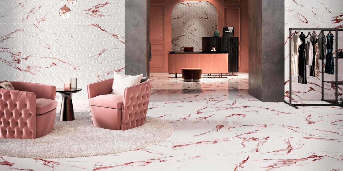-Rote Marmore: Dies ist eine weniger verbreitete, aber ebenso beeindruckende Option, besonders bei großformatigen Feinsteinzeugmarmoren. Die Keramik, die diese Marmore imitiert, kann eine reiche Palette von tiefroten Tönen mit weißen Adern bieten. Diese Farbe ist perfekt, um einzigartige Blickpunkte zu schaffen und jedem Design einen lebendigen Farbakzent hinzuzufügen.