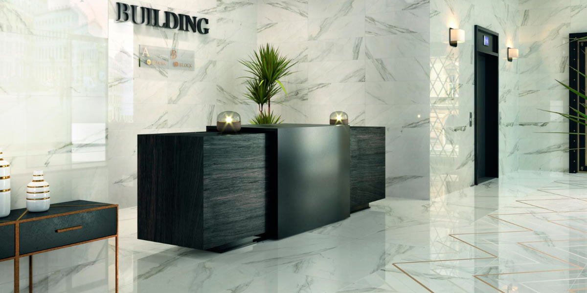 Empfangs- und Wartebereiche: Wie in Hotels vermitteln Empfangsbereiche mit großformatigen Marmoroptikfliesen ein professionelles und elegantes Image. Die polierte und durchgehende Oberfläche der großformatigen Fliesen schafft eine einladende und moderne Atmosphäre. Auch in Besprechungsräumen und Büros können diese Fliesen eine positive Wahrnehmung des Unternehmens fördern, indem sie ein Bild von Raffinesse und Erfolg vermitteln.