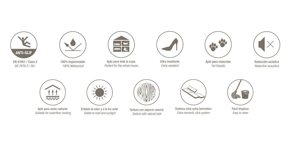 Diese Eigenschaft ist auf seine mineralische Zusammensetzung und seine mehrschichtige Struktur zurückzuführen, die verhindert, dass Wasser in das Material eindringt. Dadurch behält der Boden im Laufe der Zeit seine Form, seine Widerstandsfähigkeit und sein ursprüngliches Aussehen.