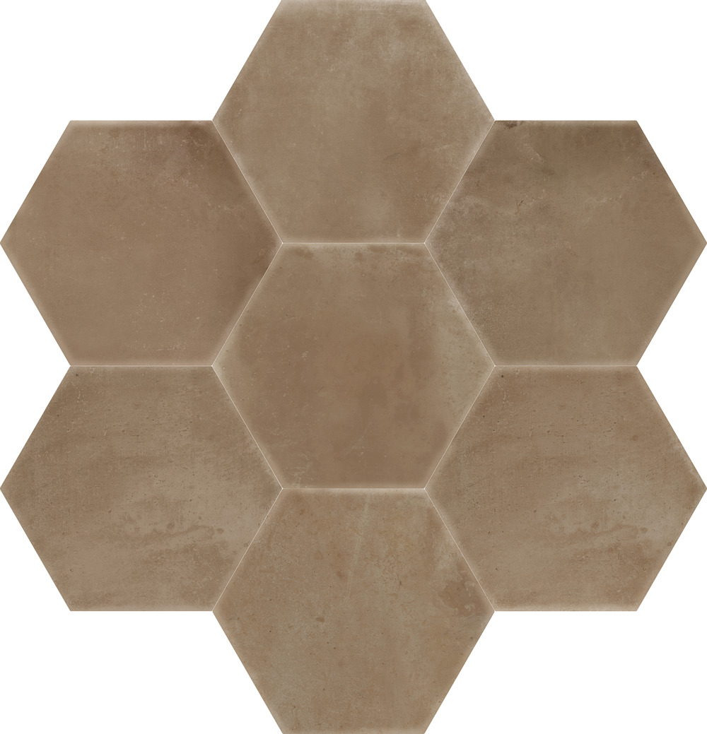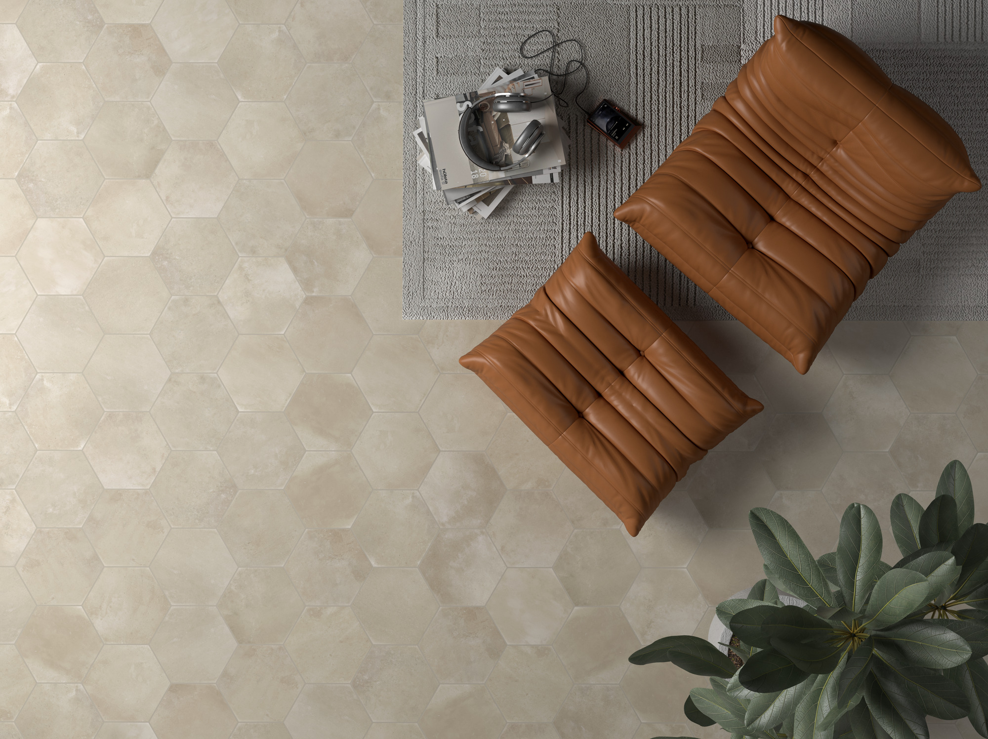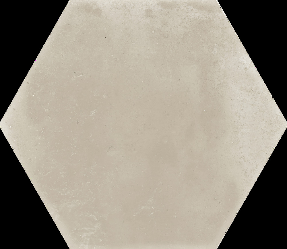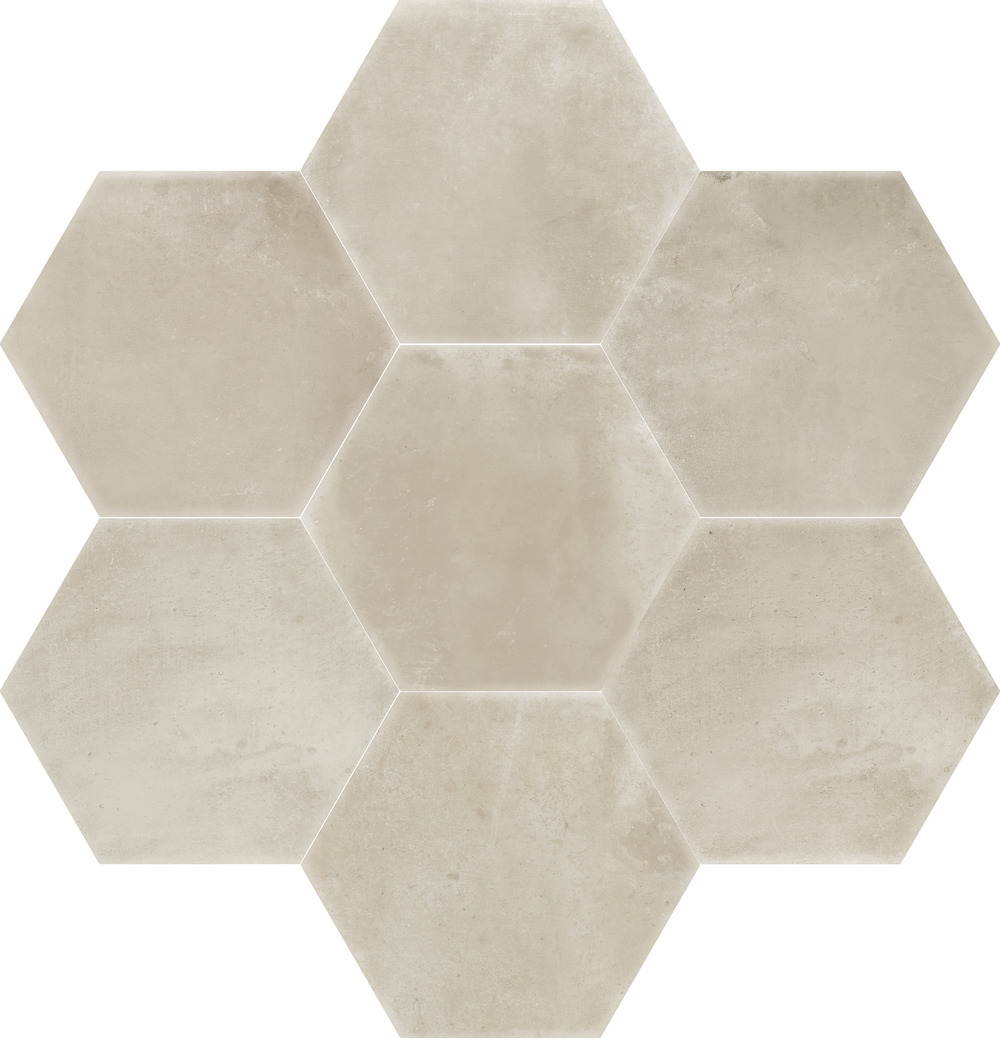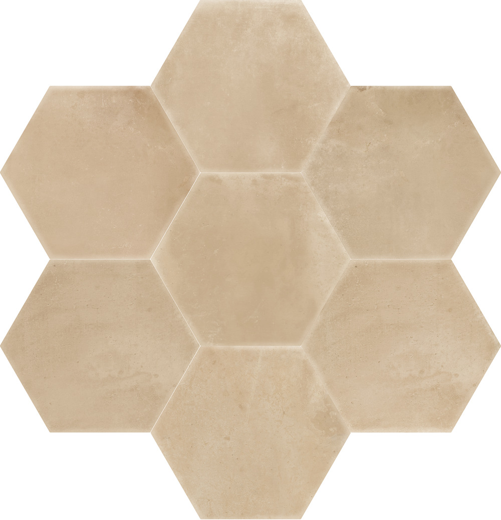 Hexagonale Feinsteinzeugfliese im Format 21,5×25 cm in einem sanften Hafer-Ton mit handwerklicher Textur und matter Soft&Safe-Oberfläche, die eine seidige Haptik bietet und gleichzeitig den Einsatz als Bodenbelag, auch in Feuchträumen, ermöglicht. Dieser Farbton verleiht Wärme und Ruhe – ideal für harmonische Räume, die mit der handwerklichen Ästhetik von Ton verbunden sind.