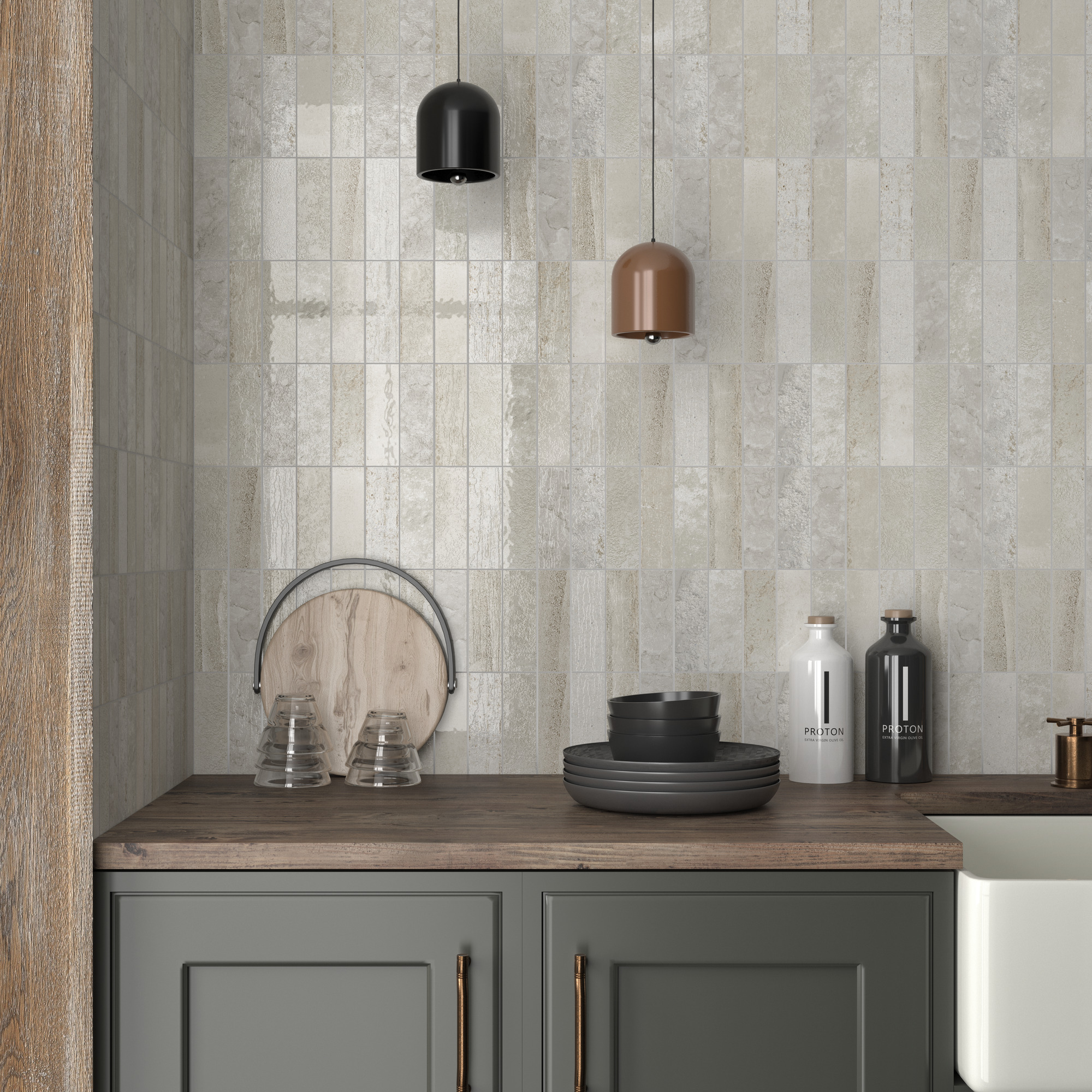 Feinsteinzeugfliese im Format 14,7×14,7 cm, deren Design einen visuellen Effekt von drei 5×15 cm-Stücken erzeugt. Dieser cremeweiße Farbton mit beigen Nuancen ist hell, neutral und mineralisch und hebt feine Texturen hervor, während er dem Raum Helligkeit und Ausgewogenheit verleiht. Ideal für ruhige, moderne Räume mit harmonischer Atmosphäre.