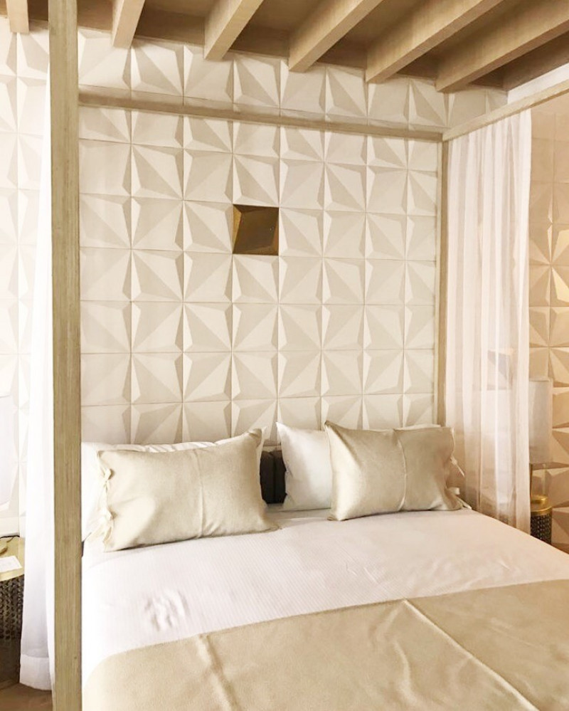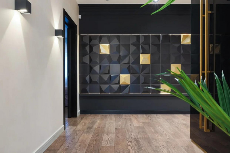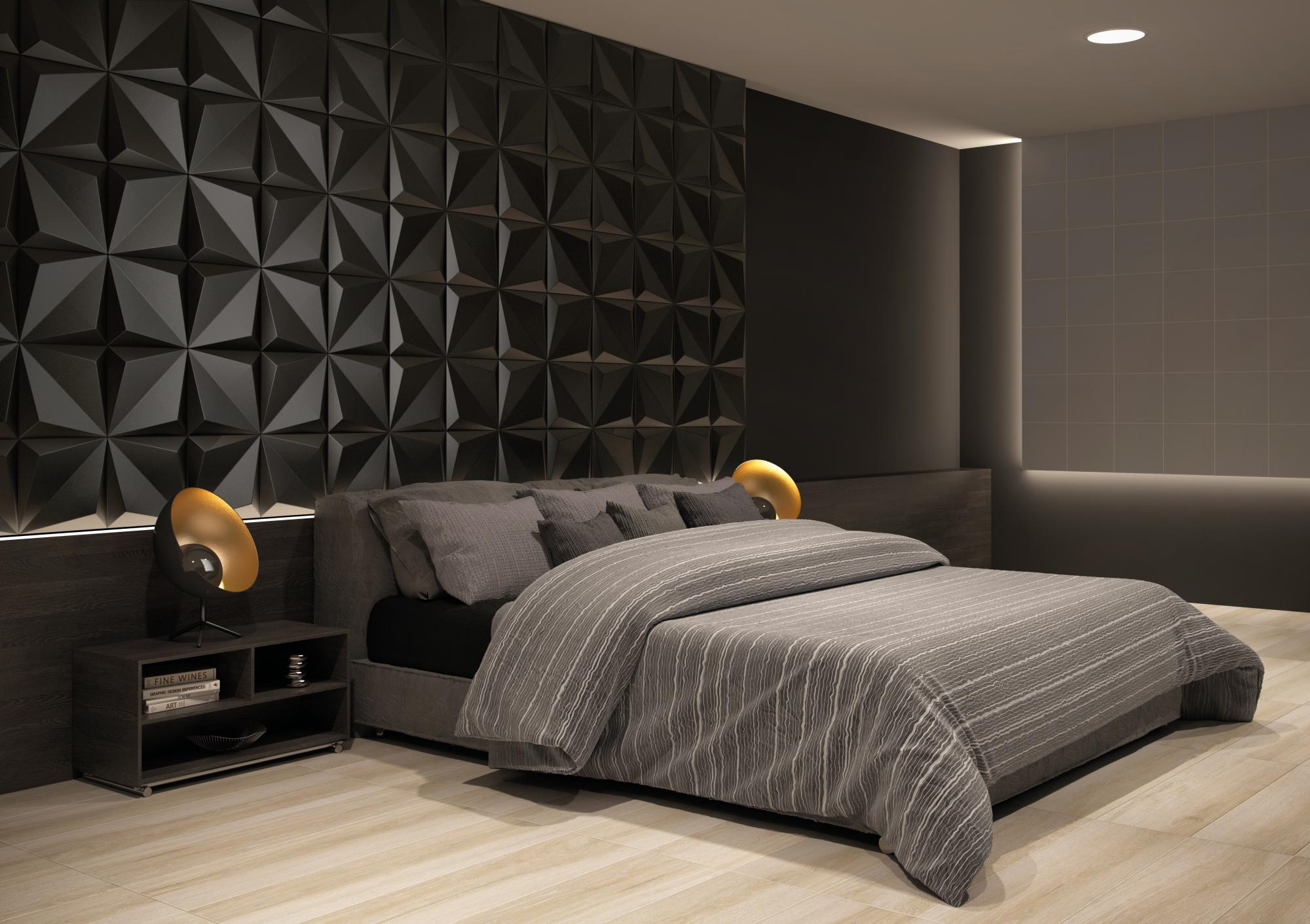 Feinsteinzeugplatte mit symetrischem, von einer Diagonalen gekreuzten 3D-Relief. Mattschwarz. Bei der Verlegung kann mit dem Volumen und Licht gespielt werden.