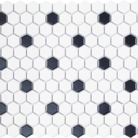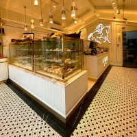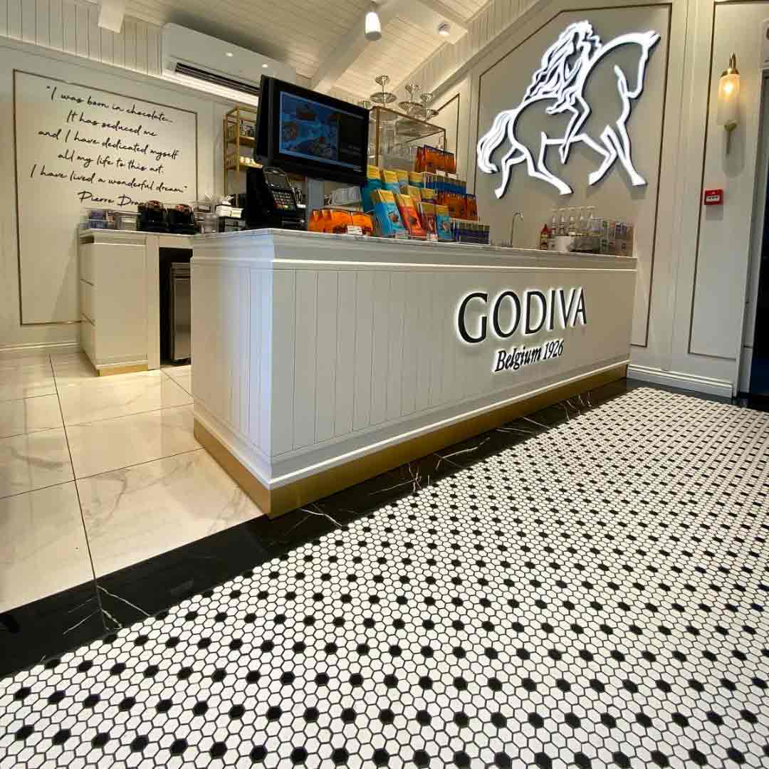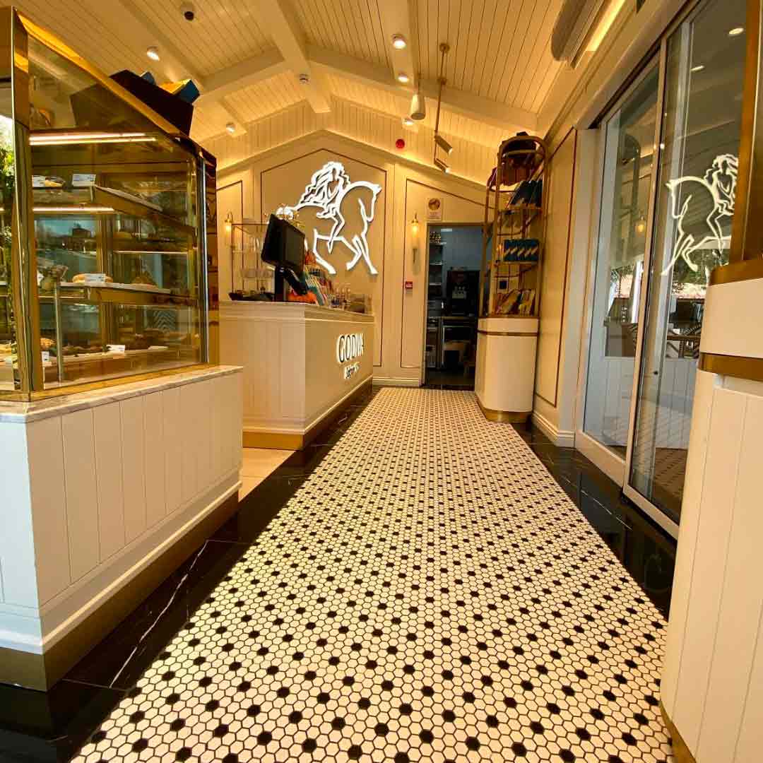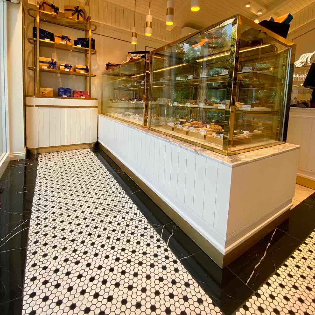 Das Design des Cafés und des Schokoladenladens wurde sorgfältig entworfen und vermittelt eine Atmosphäre von Luxus, Eleganz und Raffinesse, Aspekte, die mit der Marke verbunden sind. Unter den Elementen, die das Ensemble ausmachen, verdient der Fußboden besondere Aufmerksamkeit, der mit unserer schönen Abbot-Porzellanmosaikfliese bedeckt ist, die durch ihre sechseckigen Mosaike in Schwarz- und Weißtönen auffällt, die ein gleichmäßiges und rhythmisches Gitter bilden. Dieses klassische und raffinierte Design ist nicht nur ästhetisch ansprechend, sondern schafft auch eine visuelle Textur, die einen Kontrast zu den glatten, glatten Oberflächen der Vitrinen und Wände bildet. Der Mosaikboden verleiht dem Raum eine zeitlose Note von großem künstlerischen Wert und erinnert an den Stil der europäischen Luxusboutiquen des 20. Jahrhunderts, wo diese Art von Bodenbelag in den raffiniertesten Räumen üblich war.
