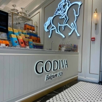 Die Elemente, die diese Einrichtung vervollständigen - hohe Decken, die klassische Kombination von Schwarz und Weiß und die goldgerahmten Glasvitrinen - tragen dazu bei, ein elegantes und attraktives Ambiente zu schaffen, das das Premium-Markenimage von Godiva unterstreicht. Insgesamt gelingt es dem Design dieses Cafés, den Geist der Marke einzufangen: ein Gleichgewicht zwischen Tradition und modernem Luxus. Die Verwendung edler Materialien wie Marmor und Glas, der sorgfältig gestaltete Mosaikboden und die goldenen dekorativen Details schaffen eine Atmosphäre, die den Kunden einlädt, in eine Welt exquisiter Aromen und sensorischer Erlebnisse einzutauchen, und das alles in einer visuell beeindruckenden Umgebung. Wir lieben es!