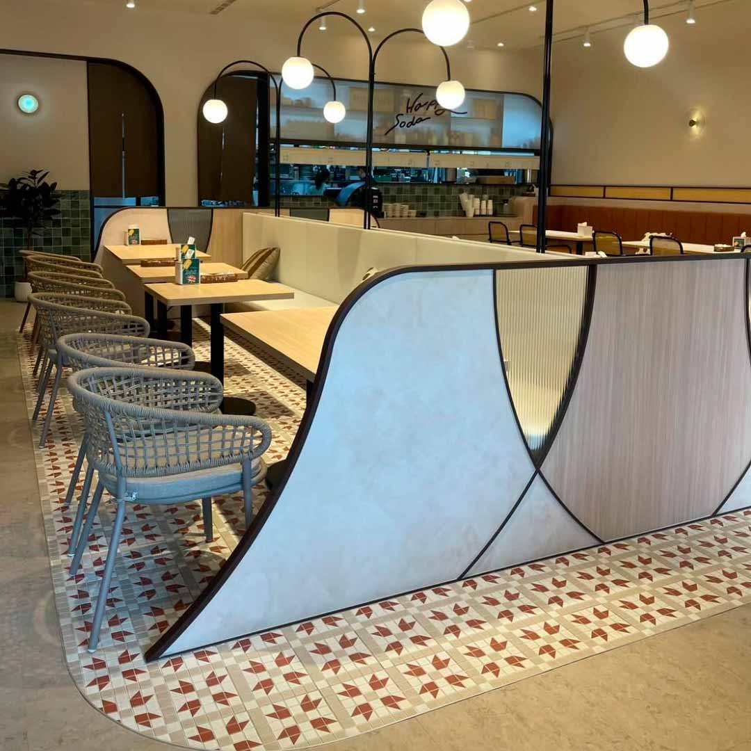 Letztendlich handelt es sich um einen Ort, der zum Verweilen einlädt. Es ist nicht nur ein Ort, um gutes Essen zu genießen, sondern eine Benutzererfahrung, die durch das Design bereichert wird, bei dem jede Ecke so gestaltet ist, dass sie fotografiert werden kann – von den geometrischen Mustern auf dem Boden bis hin zu den geschwungenen Details der Trennwände und Möbel. Wir lieben es!