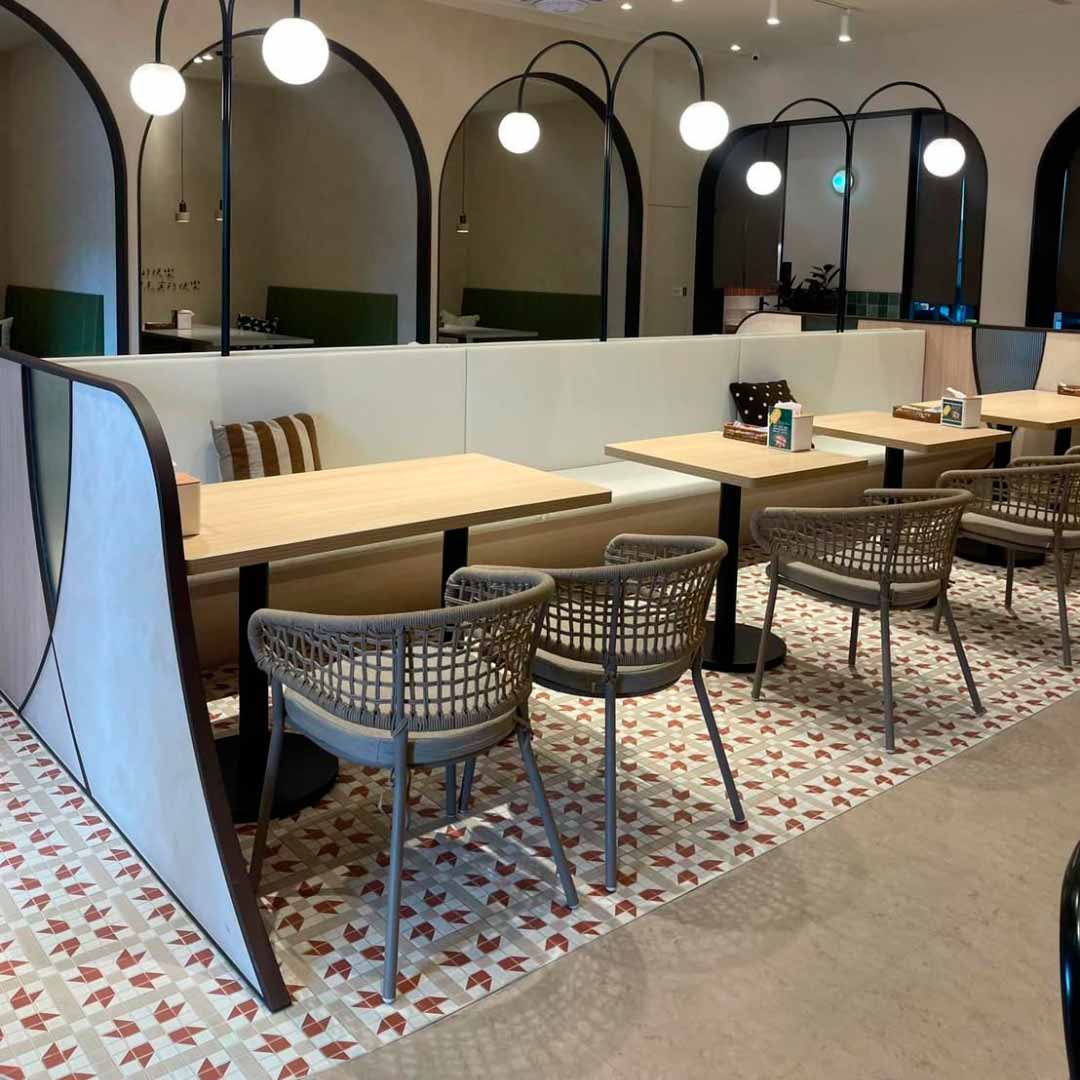 Die Trennwände zwischen den Tischen, mit ihren geschwungenen Formen und sanften Oberflächen, verleihen Intimität und Eleganz, während die Paneele mit Glas- und Holzeinsätzen Dynamik ins Gesamtbild bringen.