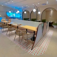 Das Restaurant findet die perfekte Balance zwischen modern und klassisch dank der Integration der hydraulischen Böden. Diese sind nicht nur eine Hommage an traditionelles Design, sondern verleihen durch ihre Umgebung mit zeitgenössischen Elementen auch einen frischen und modernen Touch. So entsteht ein spannender Kontrast zwischen den kunstvollen Mustern des Bodens und den klaren, weichen Linien des restlichen Raumes.