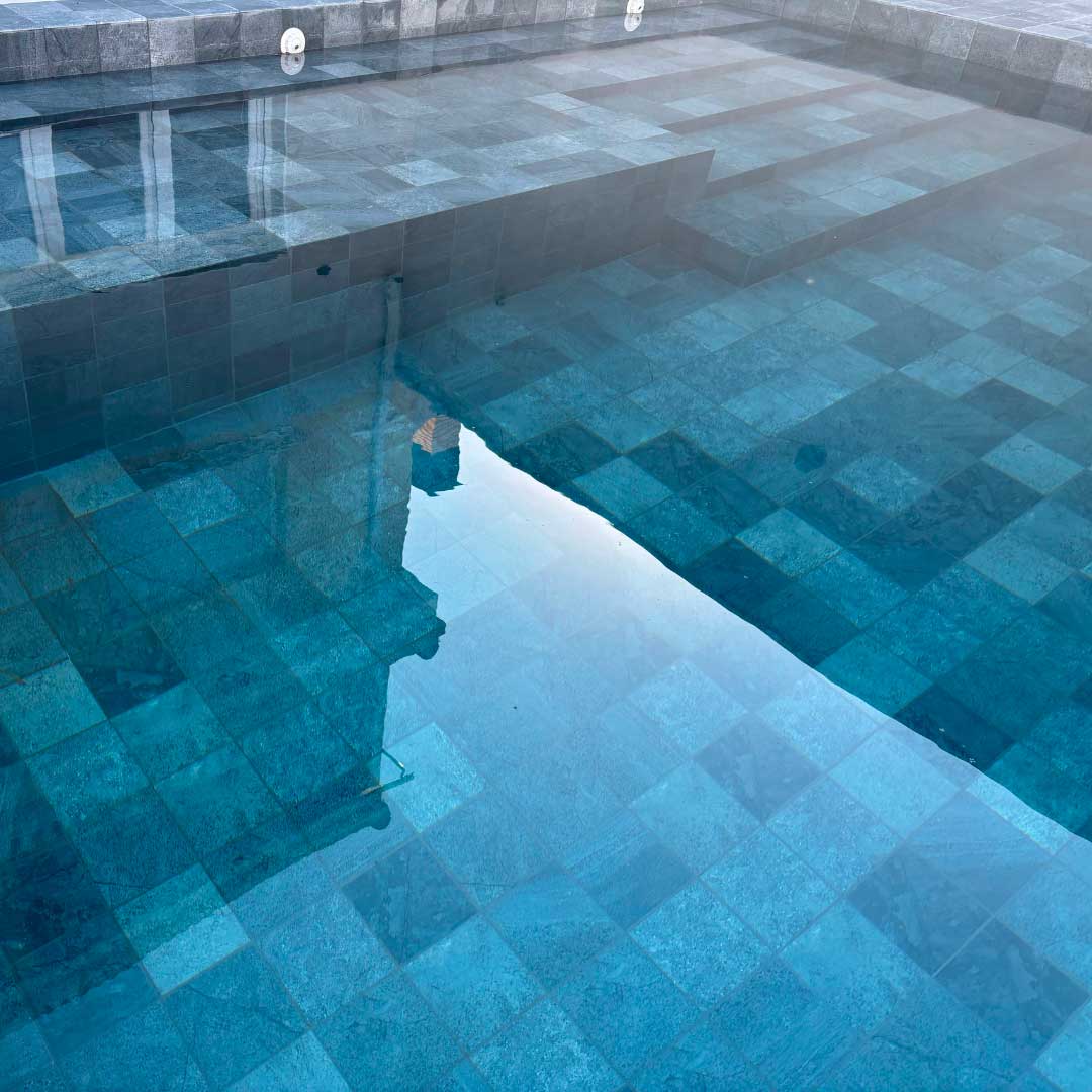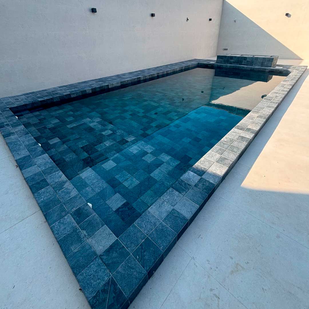 In diesem von CHG Keramik entworfenen und realisierten Projekt wurde jedes Detail sorgfältig ausgearbeitet, um ein einzigartiges sensorisches Erlebnis zu bieten. Auf den ersten Blick erzeugt der Kontrast zwischen dem hellen Außenbelag und dem intensiven Schwarz des Pools einen hypnotischen Effekt. Die Bali Negro, geliefert von Azulejos Sanguino, Verkleidung mit ihren feinen grafischen Variationen und zarten mineralischen Adern verleiht dem Wasser ein tiefes, fast traumhaftes Aussehen. Wenn die Sonne auf die Oberfläche trifft, entstehen wechselnde Lichtreflexe, die die Schönheit der Fliesen hervorheben und dem Ganzen ein Gefühl ständiger Bewegung verleihen.