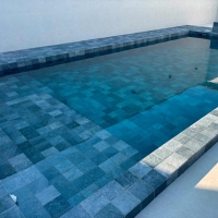 Über die optische Wirkung hinaus erfüllt das Projekt auch funktionale Ansprüche: Das Feinsteinzeug Bali Negro verfügt über eine rutschhemmende Oberfläche, die Sicherheit selbst in feuchten Bereichen garantiert, ohne dabei auf Ästhetik zu verzichten. Seine Beständigkeit gegenüber Temperaturschwankungen und Wasser macht es zudem zum idealen Material für intensiv genutzte Außenbereiche. Die Verwendung des Bullnose-Teils, das perfekt für abgerundete Kanten ist, erleichtert die Ausführung und sorgt für eine homogene Gestaltung.