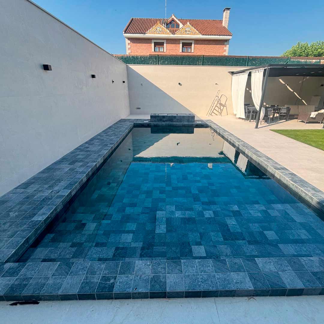 Wenn sich Design mit der Natur verbindet, entstehen Räume, die uns an Orte entführen, an denen die Zeit stillzustehen scheint. Dieses Schwimmbecken, verkleidet mit Bali Negro Fliesen, ist ein klares Beispiel dafür, wie ein gut durchdachtes Projekt einen privaten Garten in ein wahres Refugium der Ruhe und Raffinesse verwandeln kann.