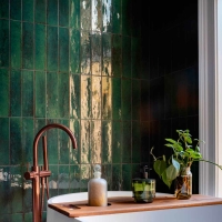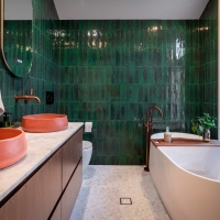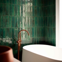 Das smaragdgrüne und kupferfarbene Bad zeichnet sich durch eine lebendige und warme Atmosphäre aus, die durch die überwiegende Verwendung unseres Bestsellers Agadir Selva, einer Fliese mit glänzender Oberfläche, die Tiefe und Textur verleiht, entsteht. Diese Farbe und ihre leichten Tonabweichungen bei jedem Stück erzeugen einen dynamischen visuellen Effekt, der an den Reichtum der Natur erinnert. Die glänzende Oberfläche der Fliesen fängt das Licht ein und reflektiert es, wodurch der Raum mit einem sanften, umhüllenden Glanz erfüllt wird.