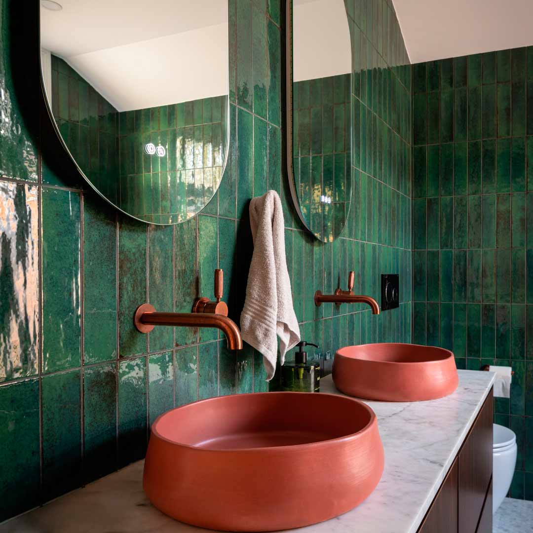 Im Großen und Ganzen sind die beiden Bäder durch eine Designphilosophie vereint, die satte Farben und helle Oberflächen mit warmen, natürlichen Materialien kombiniert. Die Wahl von Terrakotta-Waschbecken als gemeinsames Element und die konsequente Verwendung von Metallarmaturen in warmen Tönen wie Kupfer und Gold schaffen eine visuelle Erzählung, die die beiden Räume miteinander verbindet. Gleichzeitig ermöglichen die einzigartigen Farbpaletten, dass jedes Bad seine eigene Identität behält.