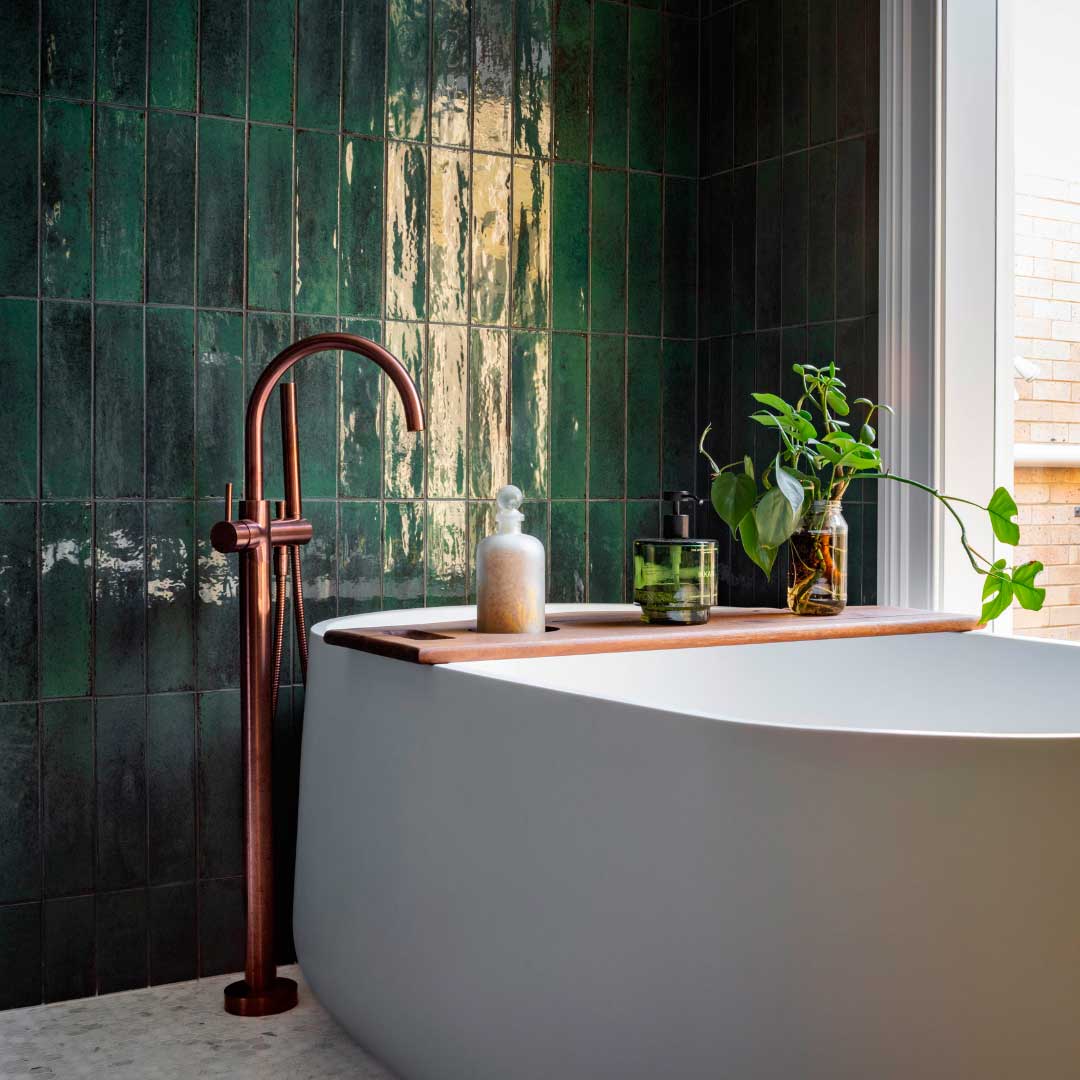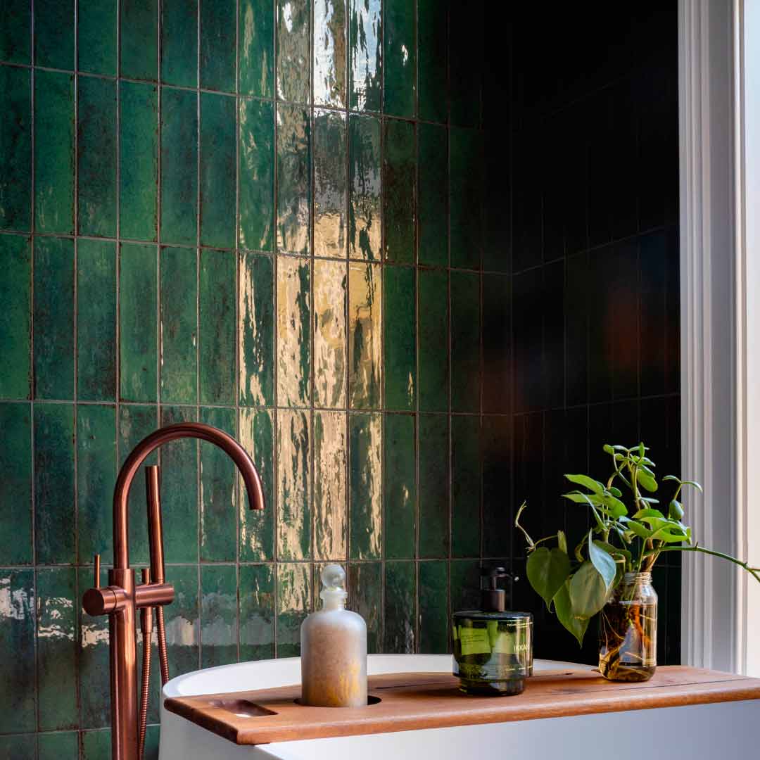Die Badewannenecke ist in der gleichen Farbpalette gehalten, mit grünen Fliesen als optischem Rahmen und einer freistehenden Kupferarmatur, die sich nahtlos in das Design einfügt. Die weiße, freistehende Badewanne bildet einen klaren und ruhigen Kontrast und hebt sich als zentrales Element ab, das zur Entspannung einlädt.