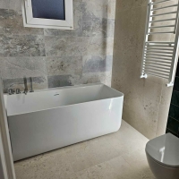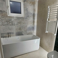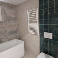 Das Hauptbadezimmer vereint drei Keramikkollektionen, die durch Texturen und Farben miteinander in Dialog treten. An Wänden und Böden bildet das Modell Pietra Viva Bone eine warme, von Stein inspirierte Grundlage mit cremefarbenen Nuancen und natürlicher Haptik. Der Toilettenbereich wird durch einen kräftigen vertikalen Akzent in tiefem Grün abgegrenzt, dank Agadir Selva, einer glasierten Fliese mit handwerklicher Oberfläche, die Glanz und Charakter verleiht. Gegenüber der Badewanne kleidet das Modell Ardesia Chiara die Wand mit einem Steineffekt in Grautönen, der mit dem Gesamtbild harmoniert, ohne ihm die Show zu stehlen.