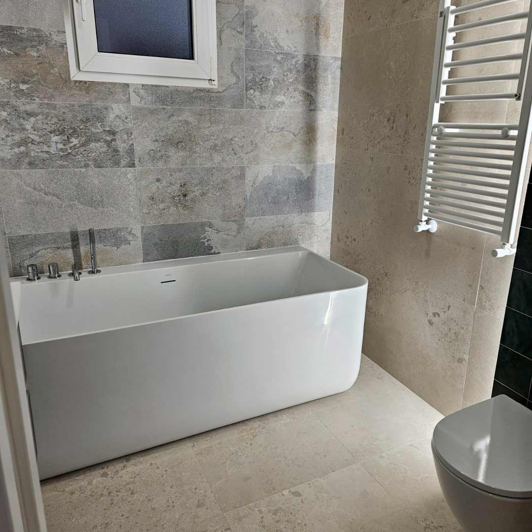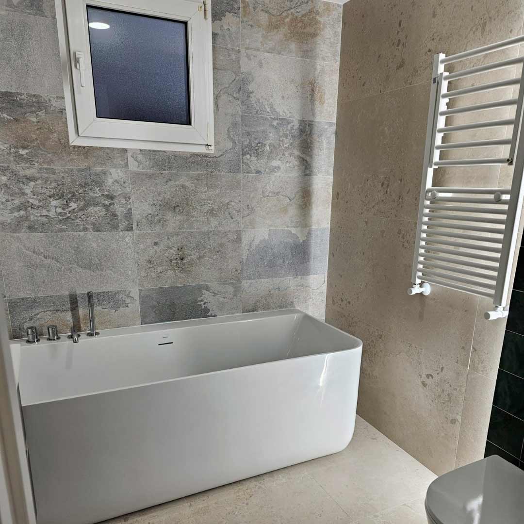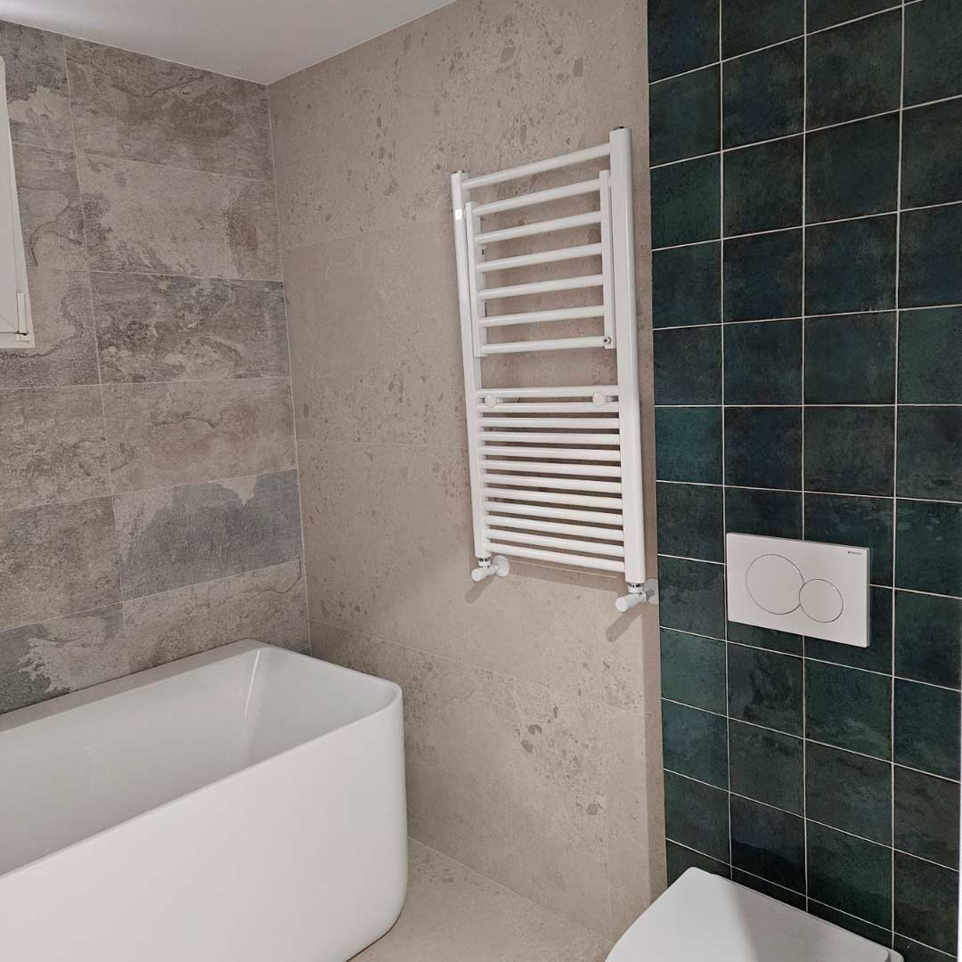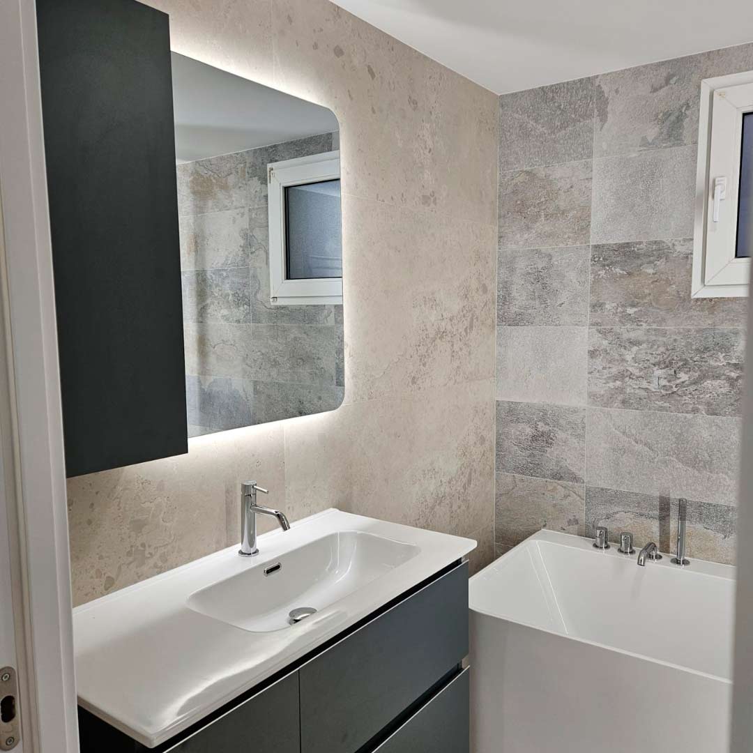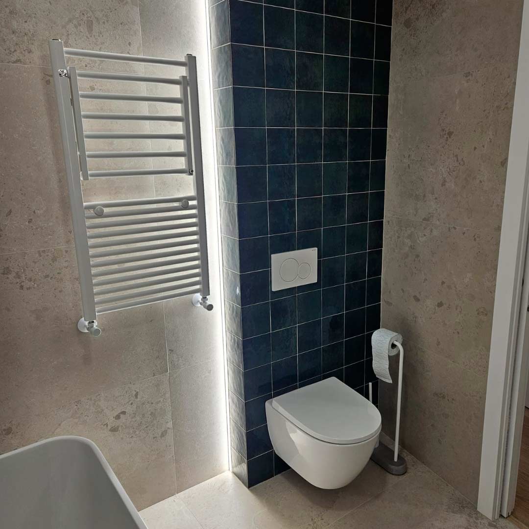 Das Ergebnis ist ein zeitgemäßes, ausgewogenes und nuancenreiches Badezimmer, in dem jede Keramikauswahl einer dekorativen und funktionalen Absicht entspricht.