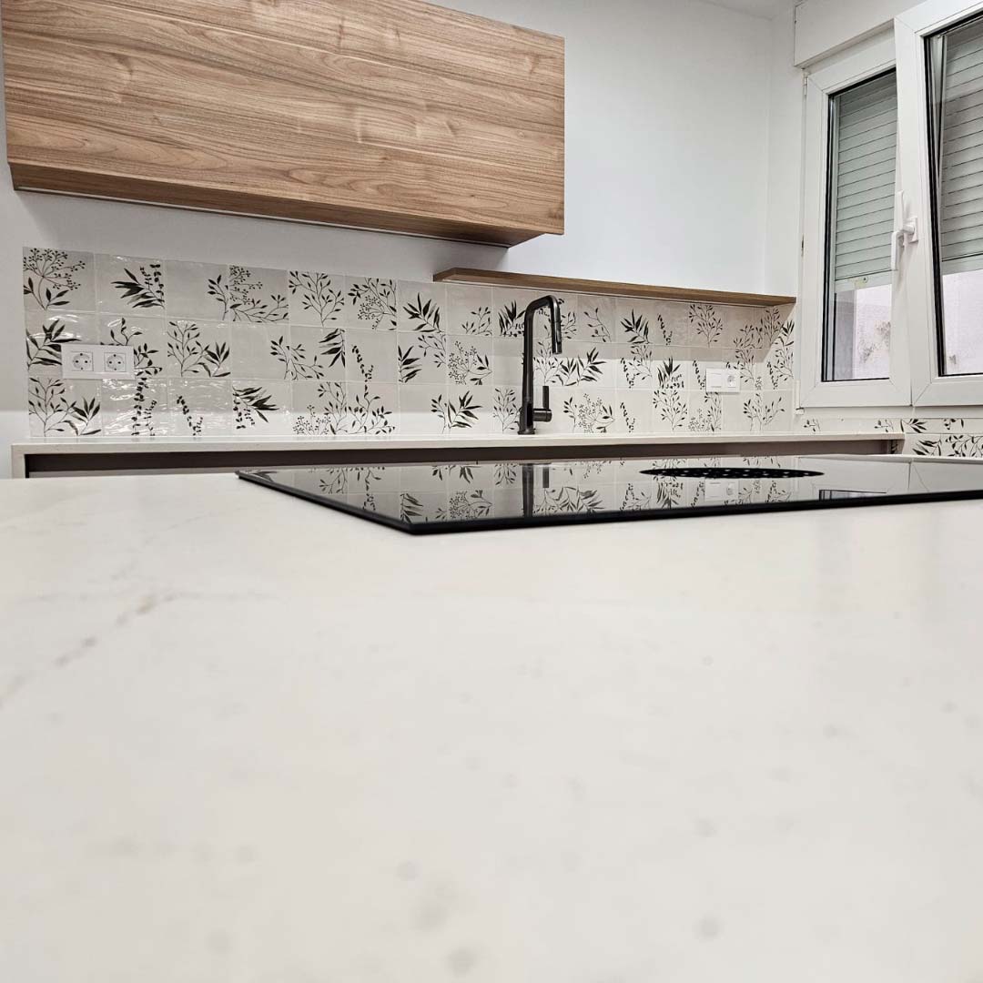 Die Wandverkleidung Olivia Verde wird zum Herzstück dieser Küche. Ihr von Pflanzenmotiven inspiriertes Design verleiht einem Raum, der von minimalistischen Möbeln in neutralen Farbtönen und hellem Holz dominiert wird, Frische und Dynamik. Die Fliesenkollektion im Format 15x15 cm, die auf halber Höhe angebracht und in einem freien Muster kombiniert ist, schafft eine perfekte Balance zwischen Rustikalem und Modernem. Die lineare Beleuchtung und die matten Oberflächen verstärken diese ruhige und funktionale Atmosphäre, die perfekt für den Alltag ist.