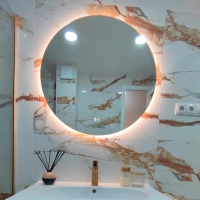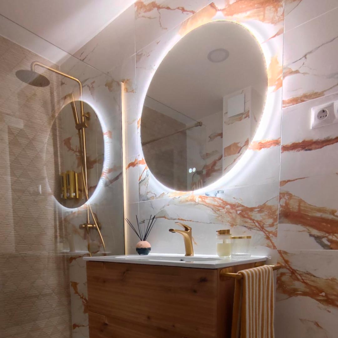 Die Accessoires und Einrichtungsgegenstände, wie z. B. die natürlichen Holzoberflächen des Waschbeckens und die goldenen Details der Armaturen und Handtuchhalter, ergänzen die keramischen Fliesen und verstärken ihren optischen Reichtum. Die Beleuchtung spielt bei diesem Entwurf eine entscheidende Rolle. Die hinterleuchteten, runden Spiegel verleihen dem Raum nicht nur ein sanftes Licht, sondern heben auch die Maserungen des Marmors hervor und verleihen dem Design mehr Tiefe und Dynamik.
