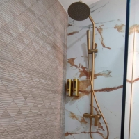 Die Fliesen werden an den Hauptwänden, einschließlich derjenigen, die den Duschbereich umgeben, und auch auf dem Boden verwendet. Dieses umlaufende Design schafft eine visuelle Kontinuität, die den Raum größer und zusammenhängender erscheinen lässt. Die Adern des Marmors sind strategisch ausgerichtet und zeigen, dass bei der Verlegung viel Wert auf Details gelegt wurde, um den visuellen Fluss zu erhalten und Unterbrechungen im Muster zu vermeiden.