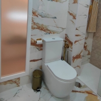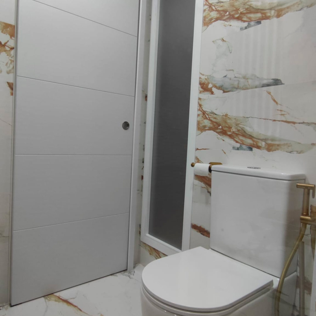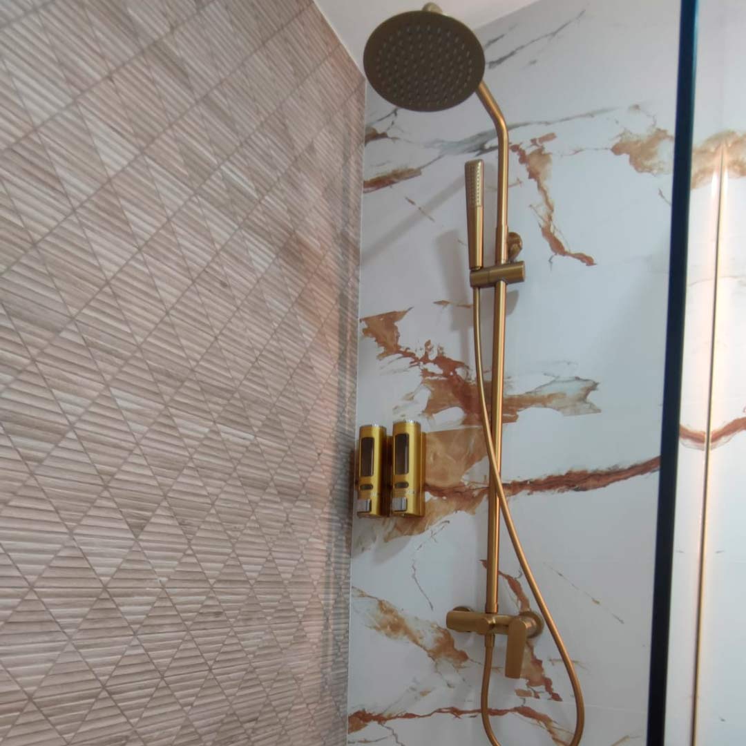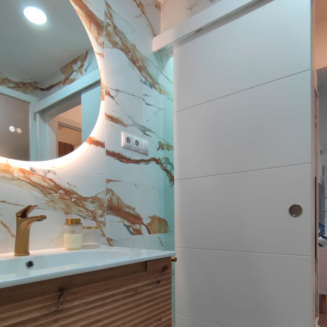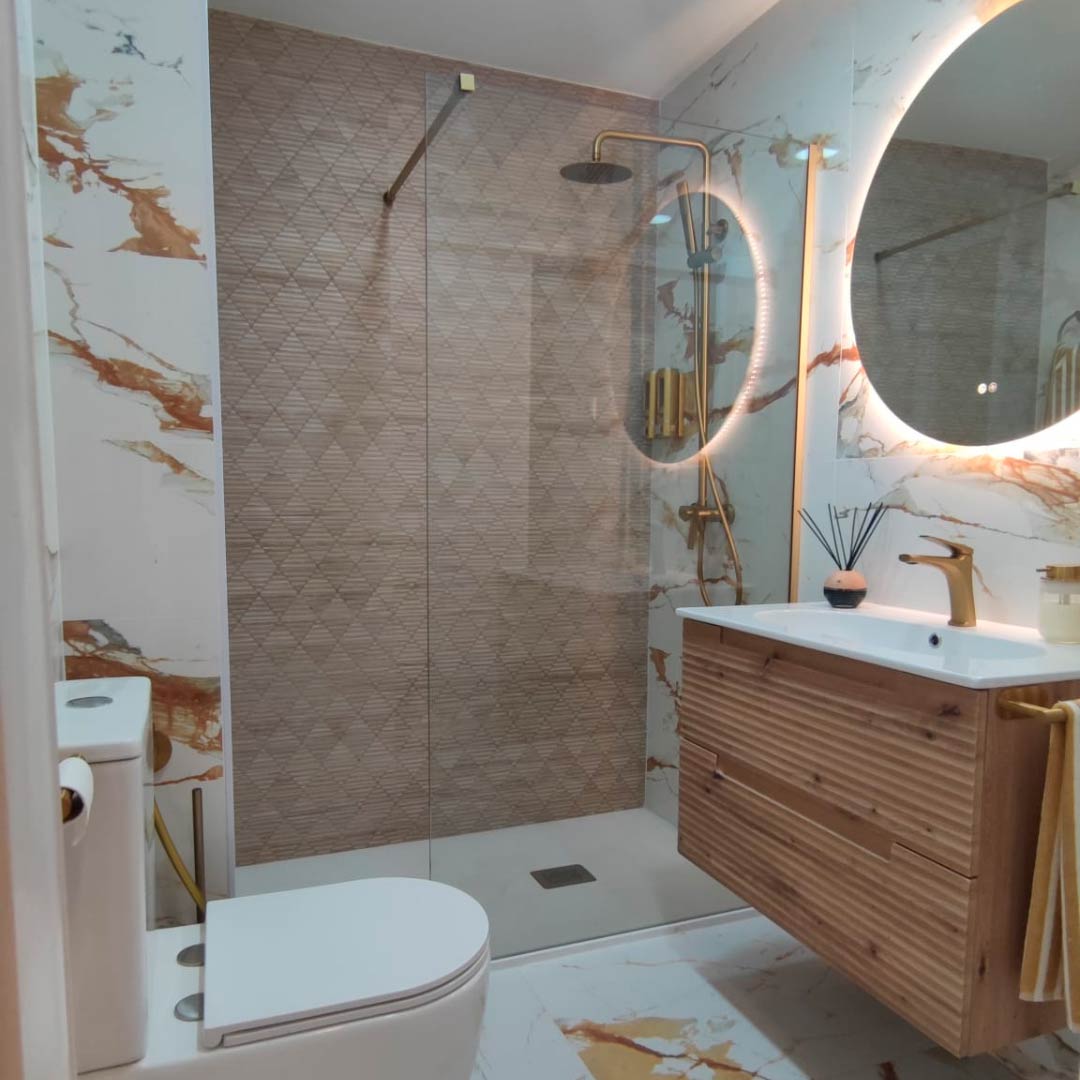 Diese vom Innenarchitektur- und Dekorationsstudio Lourdes Canillas durchgeführte Badrenovierung zeichnet sich durch ein modernes und raffiniertes Design aus, dessen Protagonist unser Keramikbelag Theia mit Marmoreffekt ist. Die Fliesen sind eine zeitgemäße Interpretation der klassischen Eleganz des Marmors, die mit warmen Tönen und goldenen Adern verschmilzt und dem Raum einen einzigartigen Charakter verleiht.