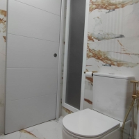 Insgesamt schafft dieses Bad die perfekte Balance zwischen Luxus, Funktionalität und Modernität. Die Marmorfliesen sind das Herzstück des Entwurfs und vermitteln ein Gefühl von Exklusivität und Raffinesse, während die anderen Details Wärme und Textur hinzufügen und so einen Raum schaffen, der sowohl praktisch als auch visuell beeindruckend ist.