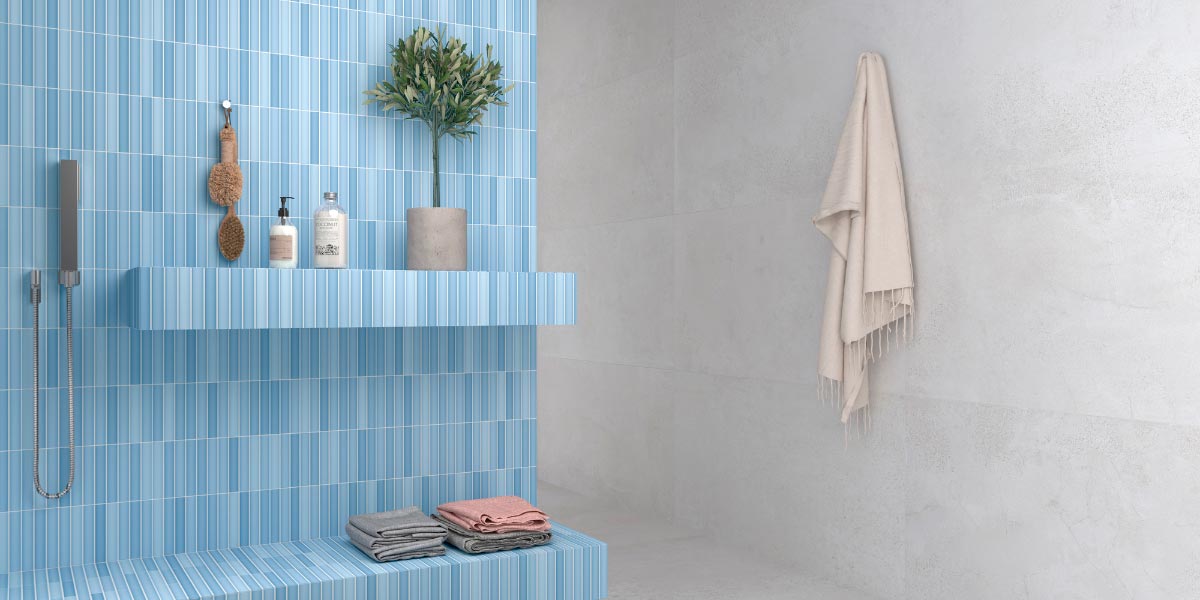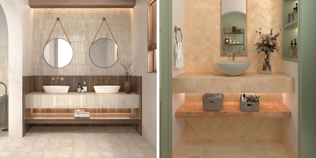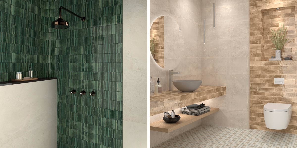 Green in its different shades (olive, emerald, mint) combines with beige tiles to create bathrooms that evoke nature and well-being. An ideal proposal for those seeking a relaxing and lively atmosphere.