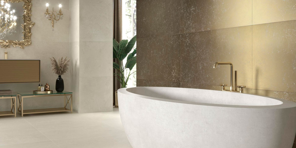 Gold, applied in tiles with metallic details or decorative pieces, brings a sophisticated and elegant look. Paired with beige, it creates a warm and welcoming luxury atmosphere, ideal for contemporary bathrooms with a touch of glamour.