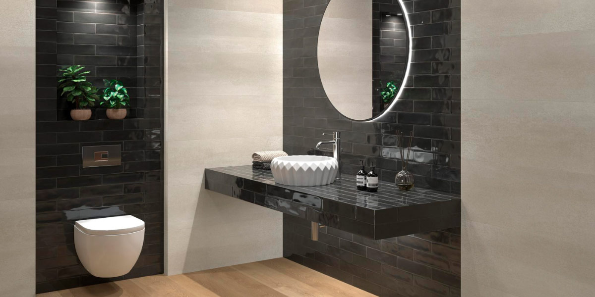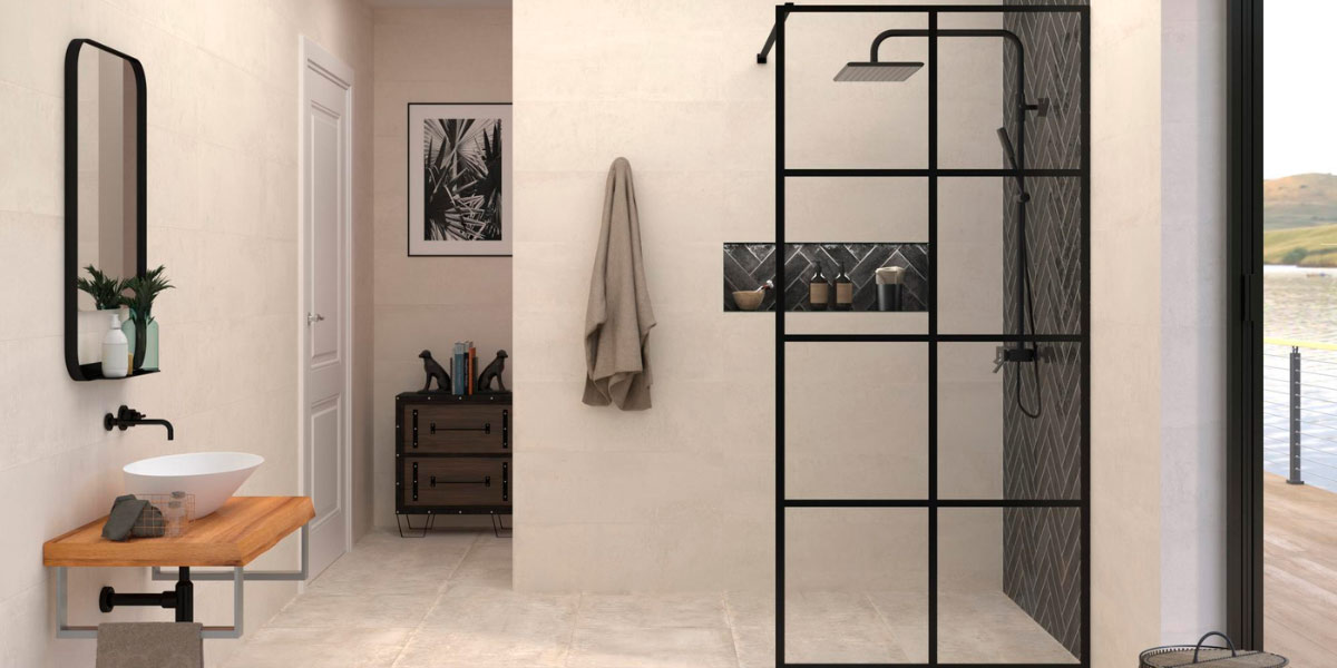 The contrast between the softness of beige and the strength of black creates sophisticated, modern bathrooms. It can be applied as beige floors with black walls or details such as black mosaics framing shower areas against a beige background.