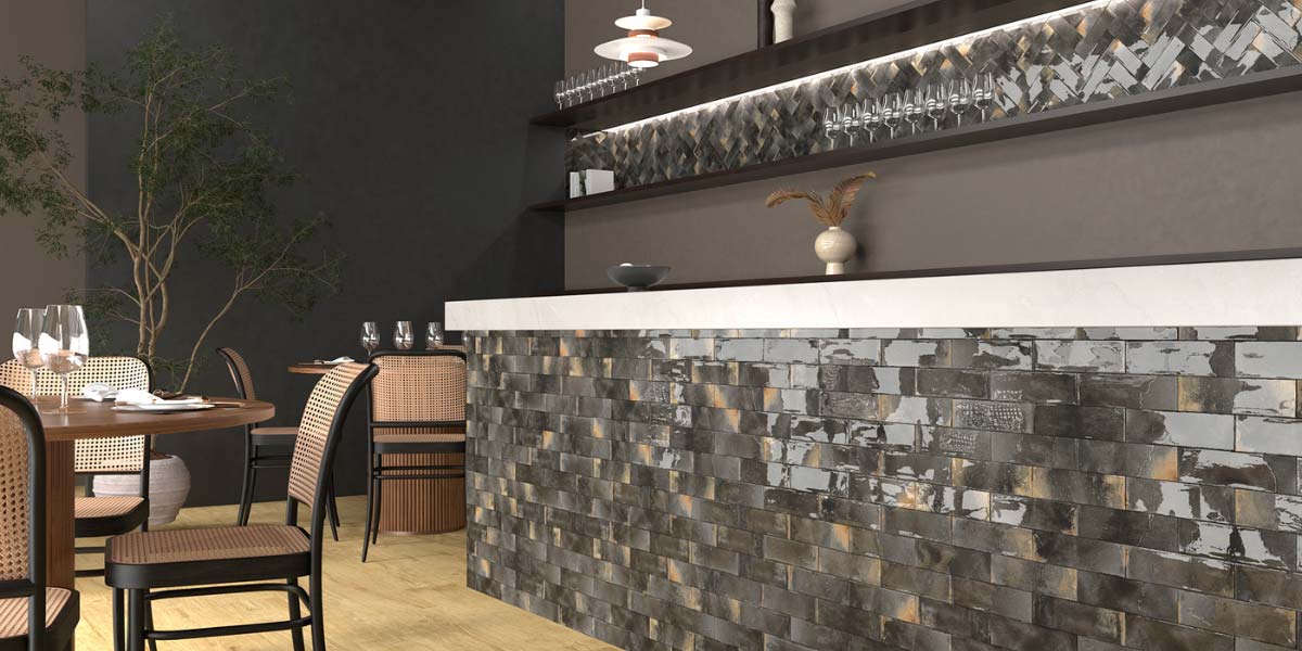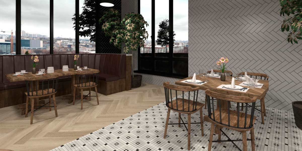 In restaurants, the combination becomes more dynamic thanks to geometric mosaics used on bars, floors, or accent walls, adding personality and reinforcing brand identity.