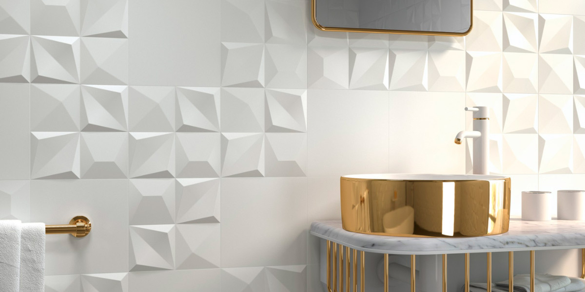 Tiles with hexagonal, rhomboid, or three-dimensional shapes add an extra touch of modernity. In black and white, these pieces can create accent walls, sculptural coverings, or floors with strong personality. White ceramic reliefs add texture and movement, while black reliefs intensify the play of light and shadow.