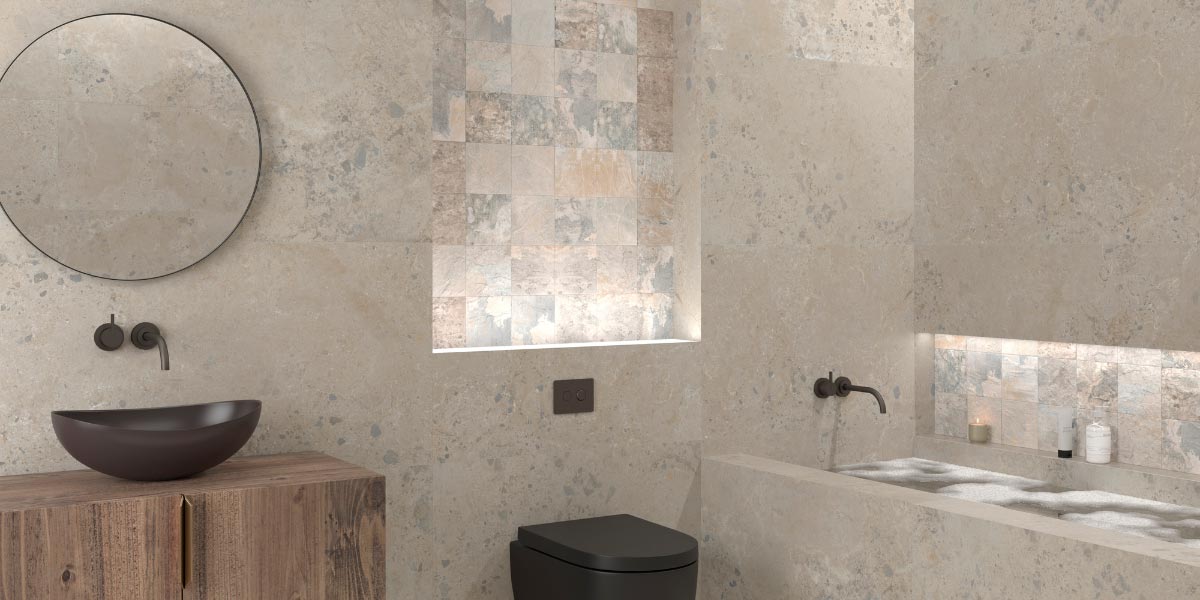 - Bathrooms in neutral tones with a matt finish. Seamless rectified tiles in beige, light grey or matt white tones are ideal for a minimalist and relaxing bathroom. The absence of visible joints provides a sense of order and cleanliness that turns the bathroom into a real haven of calm.