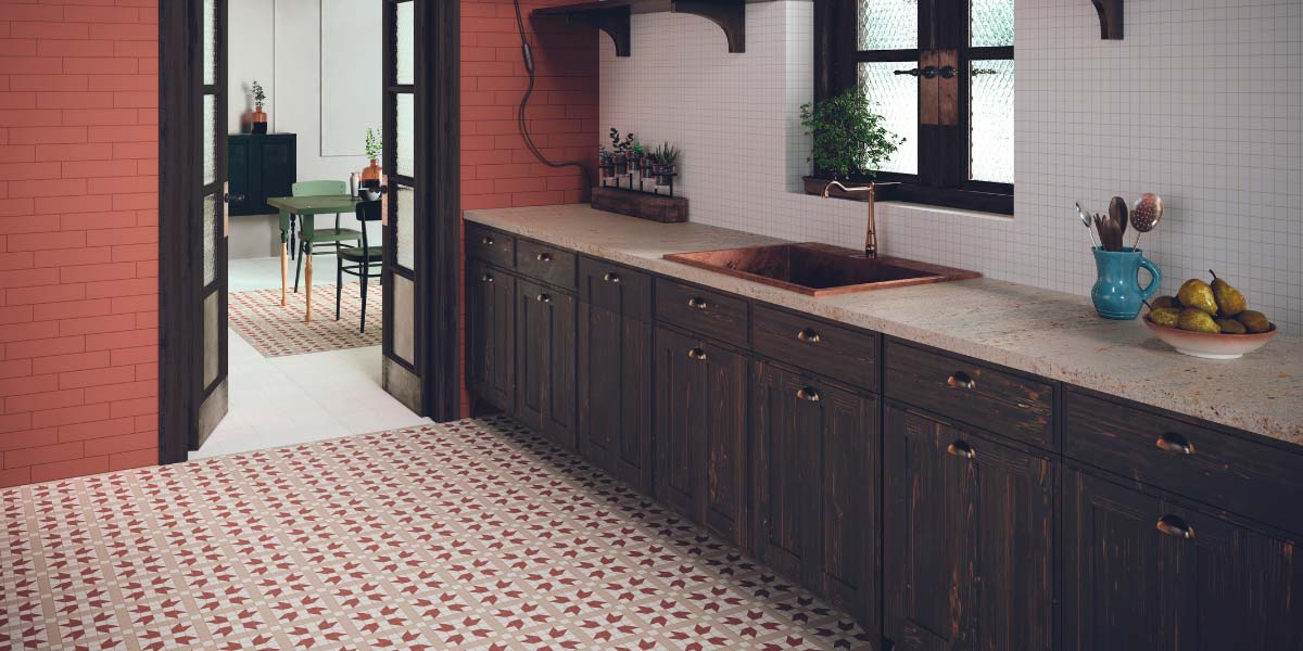2.- Floor with personality. Covering the kitchen floor with hydraulic tiles can completely transform the space. Floral or geometric designs bring energy to the environment, while a grey or earth-toned palette creates a warmer, more balanced atmosphere. Plus, they’re durable and easy to clean.