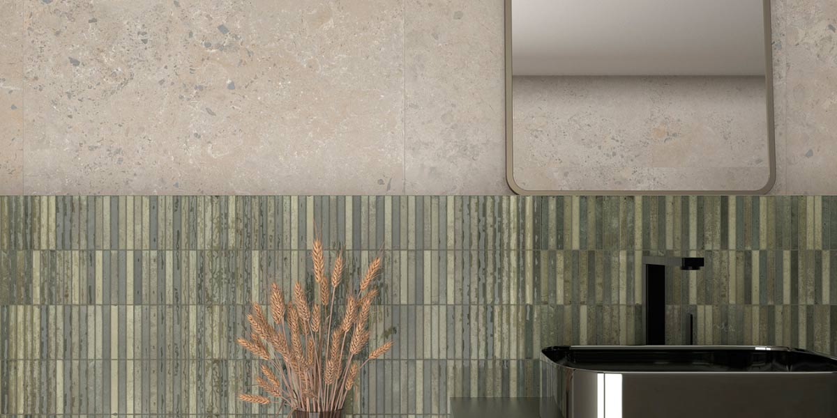 This combination is particularly effective in residential kitchens and bathrooms. Large-format stone-inspired flooring can be paired with a mosaic-style splashback, creating a contrast between the visual strength of the stone and the delicate craftsmanship of the small tiles. Similarly, a bathroom clad in neutral tones can gain personality with a shower niche or a secondary wall covered with small tiles in contrasting colours, achieving a vibrant effect without losing the overall harmony of the space.