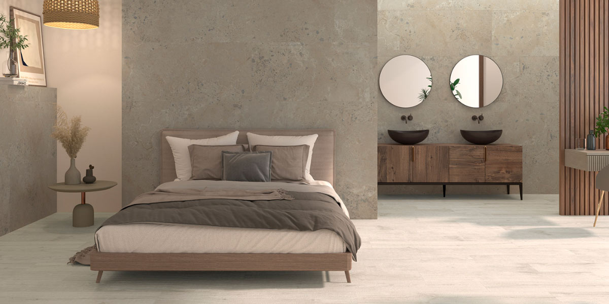 1.- Warm minimalism. Combining light-toned stone with natural wood and soft textiles creates serene atmospheres, perfect for wellness areas, spas, boutique hotels, or minimalist design homes. Porcelain provides continuity and durability, while organic elements soften the overall effect.