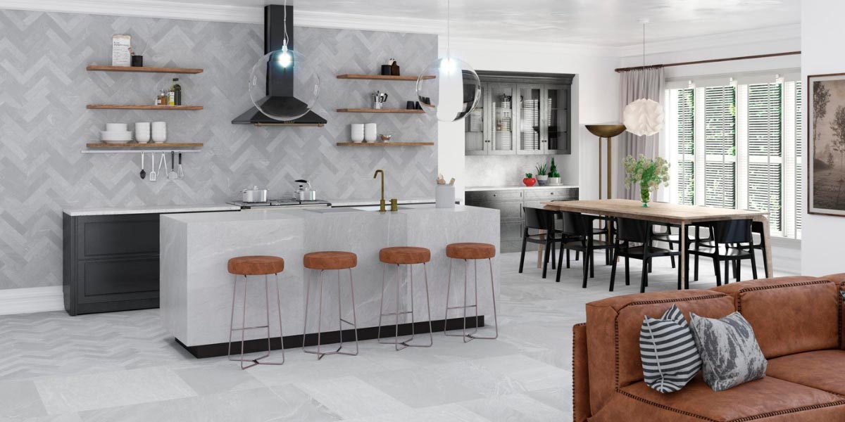 Smooth or gently textured finishes work best to follow the kitchen’s lines without creating harsh breaks. If the kitchen includes a bar, distinct tiles—like wood-effect or herringbone—can highlight that space and give it character. This creates a balance between function, style, and openness.