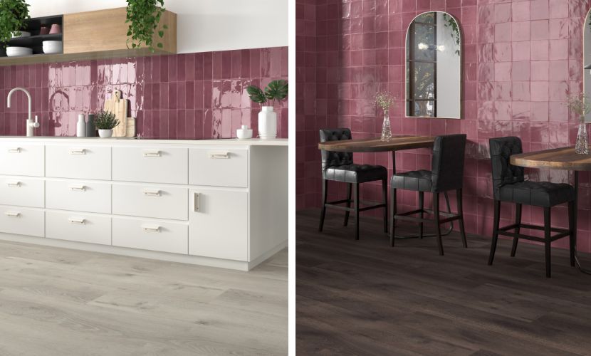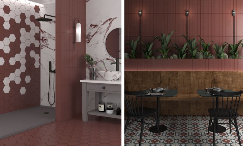 On the other hand, within the small format series, the Tabarca Garnet tile is also a very trendy option, thanks to its colour. The variety of its format, available in square or rectangular tiles, allows the pieces to be combined with each other.