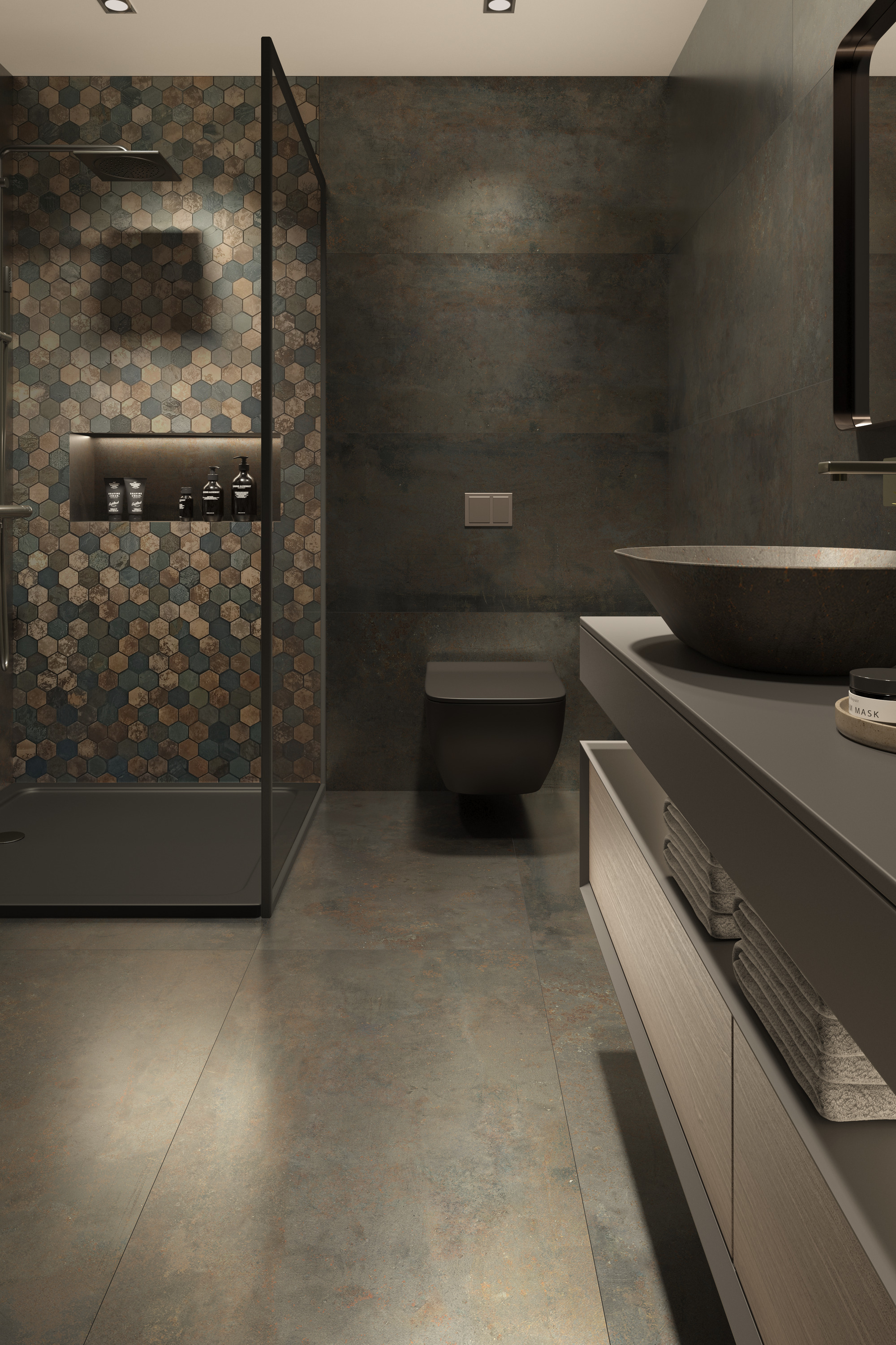 Impressive porcelain washbasin, decorated by hand with the OXIDE range of tiles. Large, avant-garde design with narrow walls. The washbasin surface accurately recreates the appearance of metal oxidized over time.