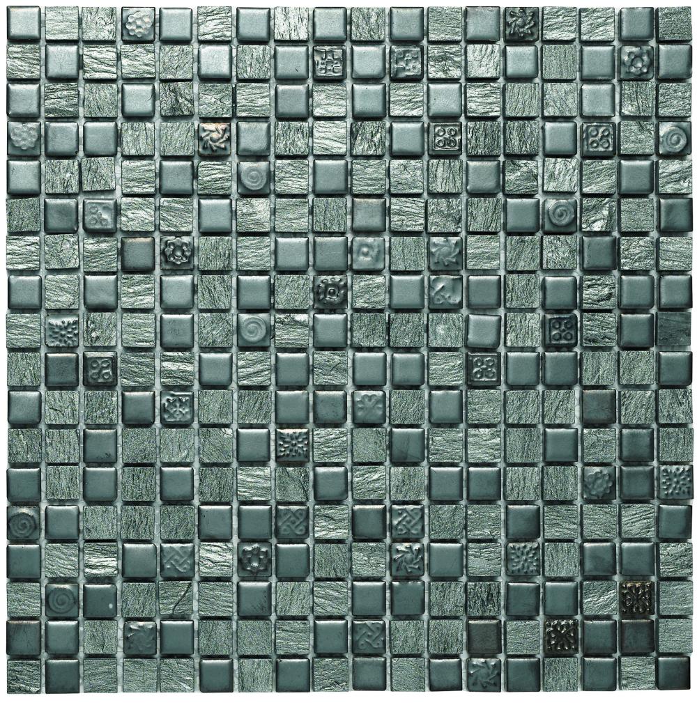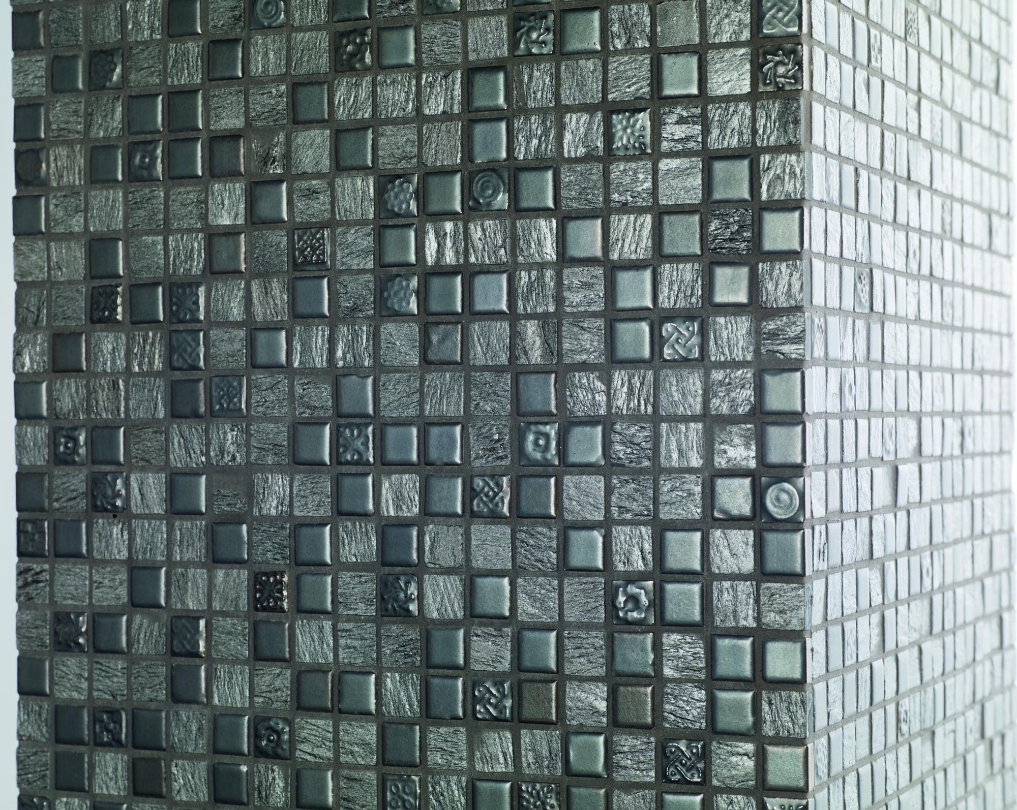 Ceramic mosaic of two-tone silver and metallic squares and surface engravings.