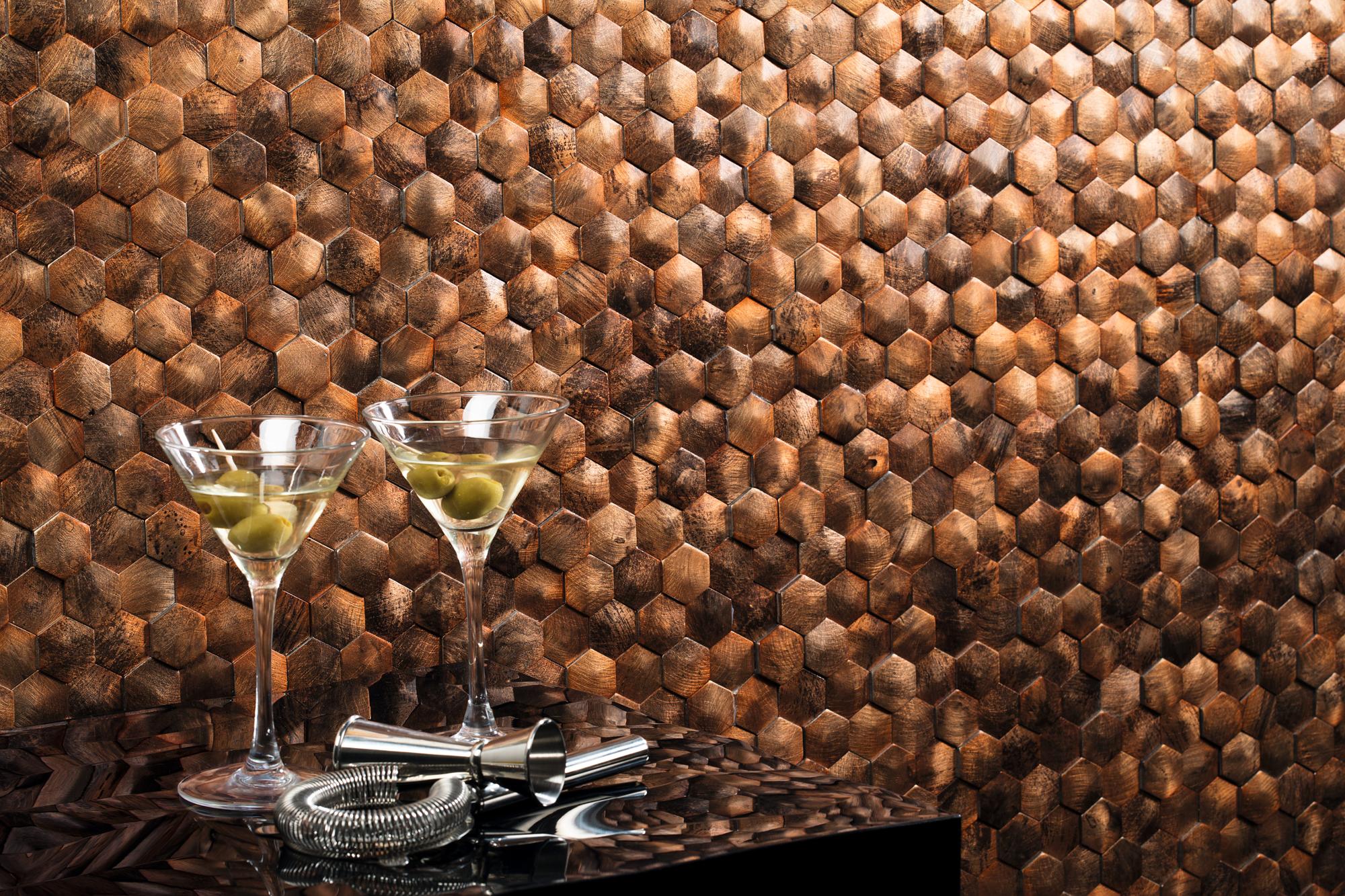 The red and brownish tones of this aluminium mosaic, consisting of small hexagons, resembles the colour of weathered corten steel.
