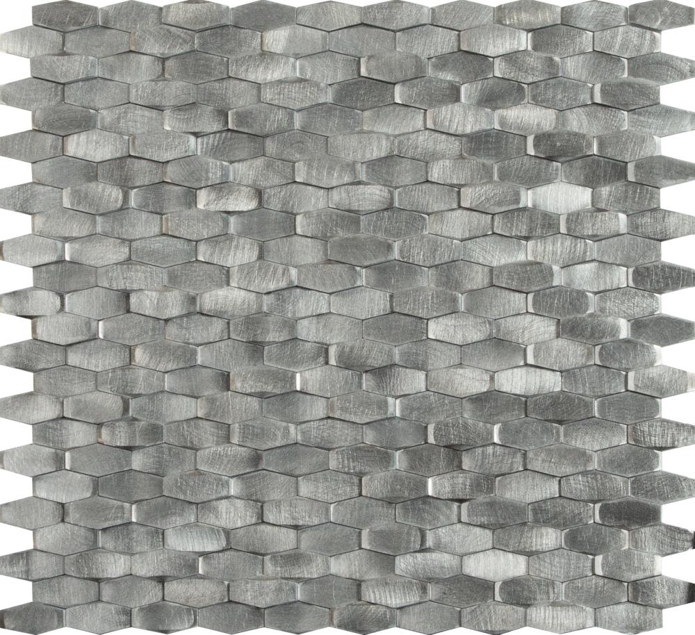 Innovative, aluminium mosaic tiles in the shape of irregular 3D hexagons. The brushed surface finish reflects the light, giving the tiles a striking, dynamic appearance. Soft silver colour with a touch of warmth. Beautiful pieces which may be combined with any style of tiles.