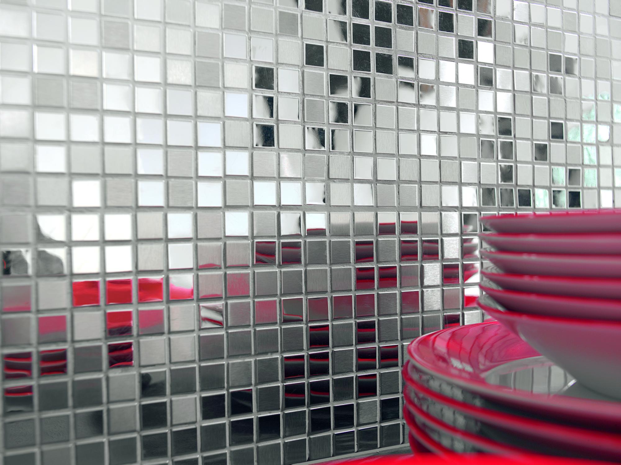 Mosaic of silver-plated inox with gloss and matt combinations.