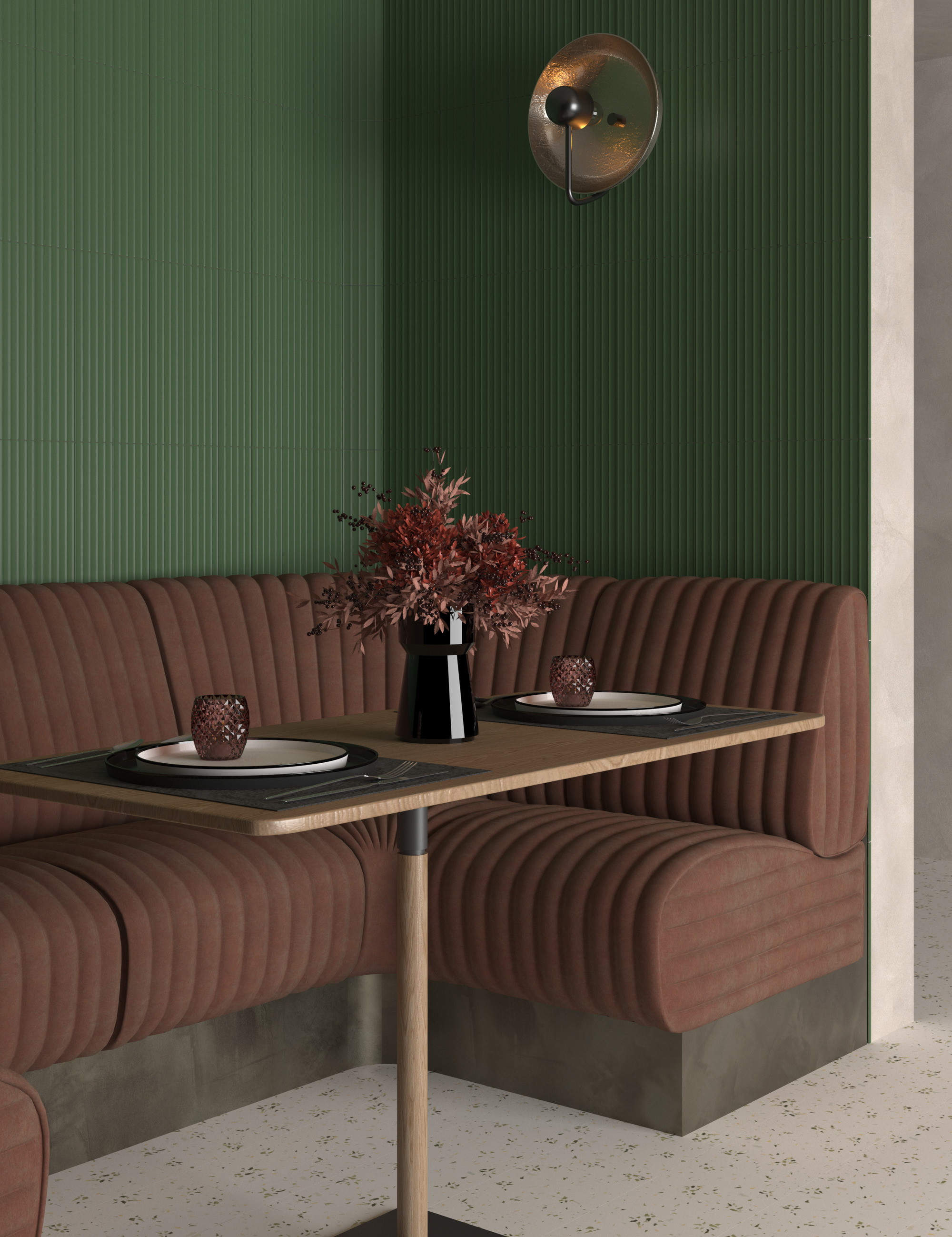 In a blue tone that conveys serenity and a contemporary flair, this fluted wall tile in 10×40 cm format is designed to bring dynamism to spaces. The fluting accentuates the play of light and shadow, while its matte finish makes it a sophisticated choice for interiors with personality. Ideal for reinforcing the visual language of the Fragmenta terrazzo.