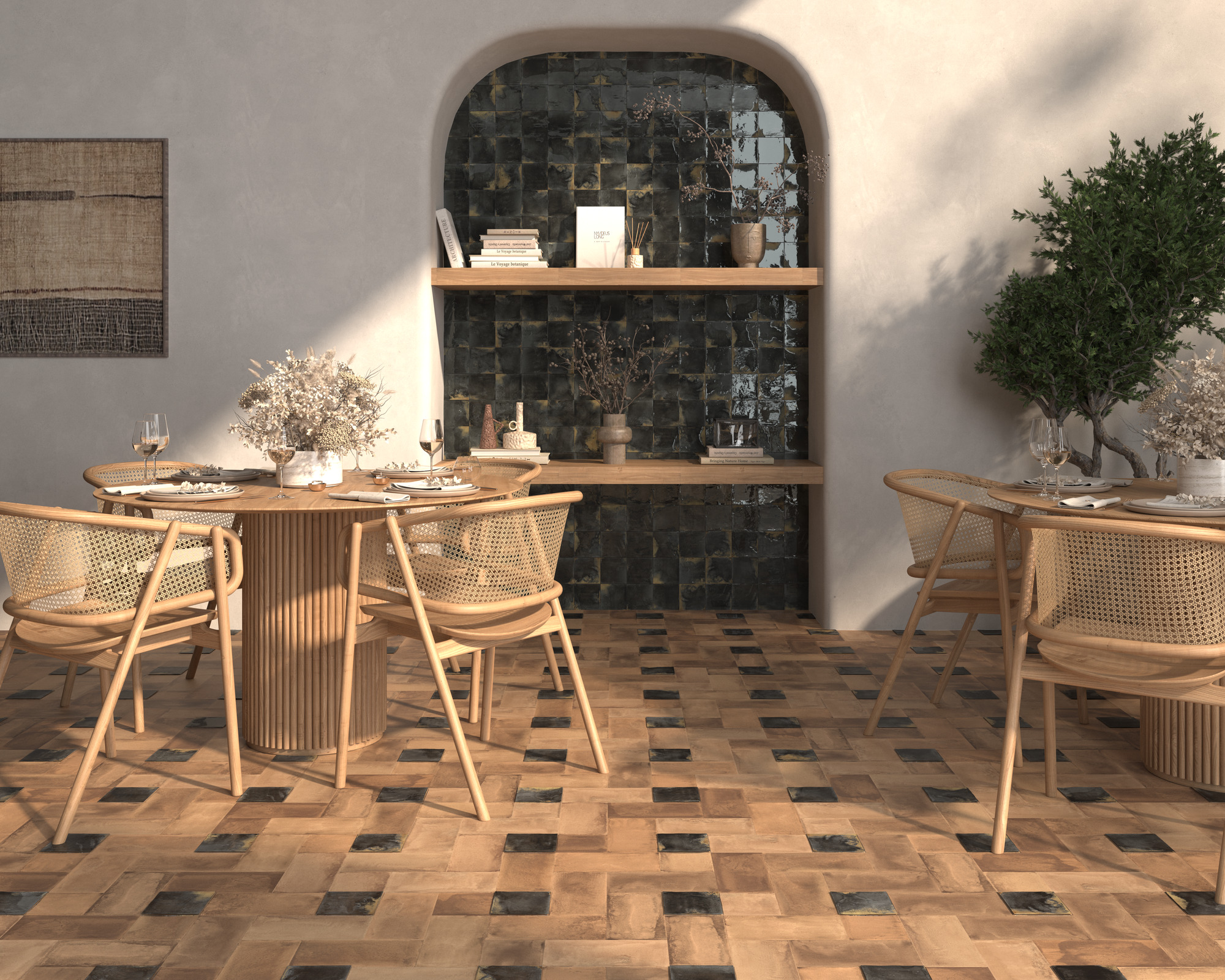 A beautiful porcelain tile in an 11.5x11.5 cm format with a glossy finish that adds depth and sophistication to any space. Its dark and intense tone contrasts with the warmth of the rest of the series, bringing an elegant and timeless touch. Thanks to its small format, it integrates perfectly into modular compositions with the Xàbia series, allowing for spaces with great visual richness and balanced contrasts.