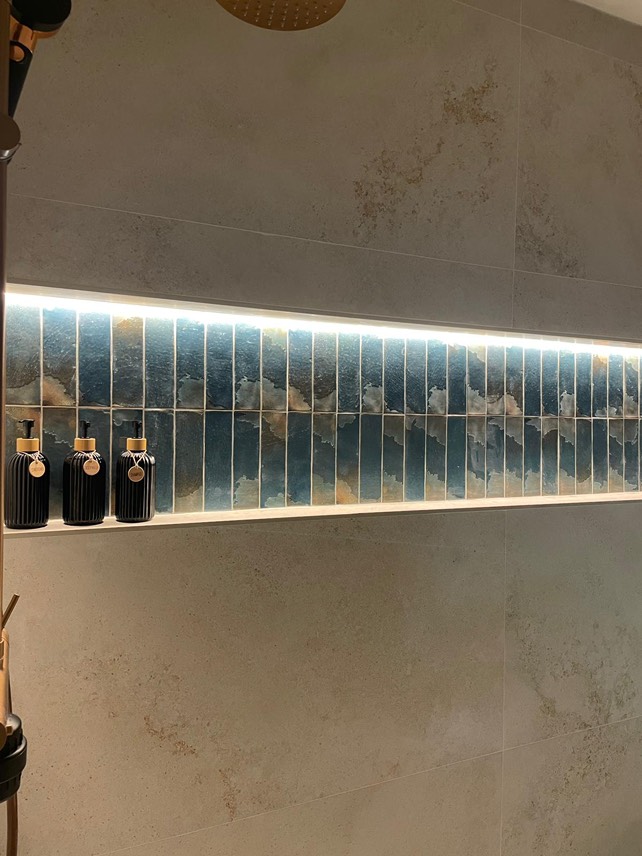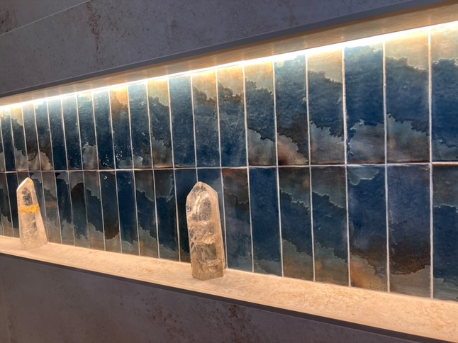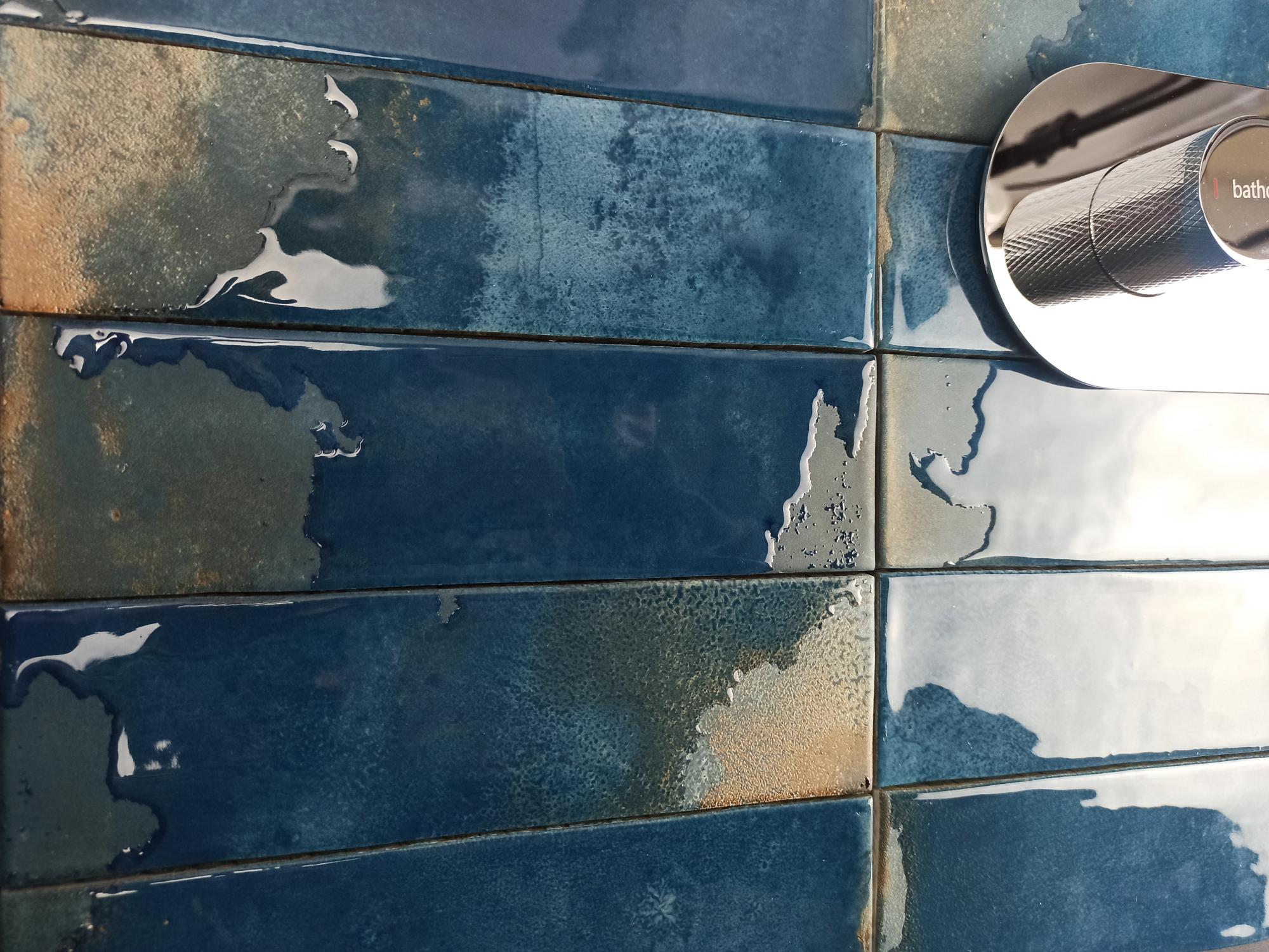 In a 6.4x22.3 cm format with a glossy finish, this porcelain tile captures the depth and majesty of the Mediterranean Sea. Its deep blue tone evokes the vastness of the ocean and the serenity of calm waters, adding character and sophistication to any space. With a rippled surface that enhances light reflections, this piece embodies the beauty of handcrafted ceramics, merging tradition and design into an authentic and dynamic finish.