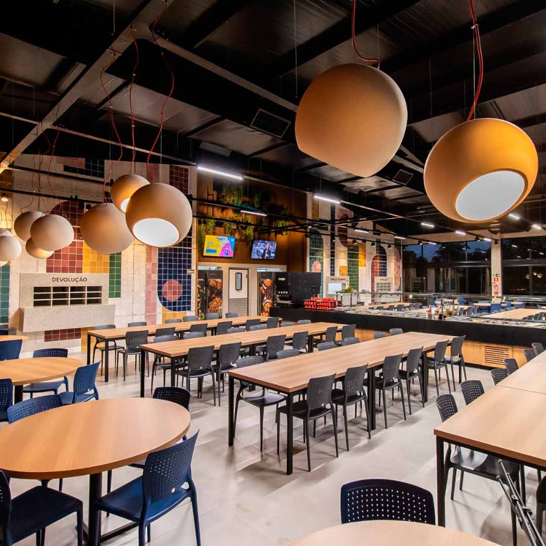 The choice of materials, combined with the warmth of ceramic tiles, contributes to creating a contemporary and inviting atmosphere. Strategically placed pendant lamps add a sense of movement to the symmetry of the tables, reinforcing the overall visual and functional balance.
